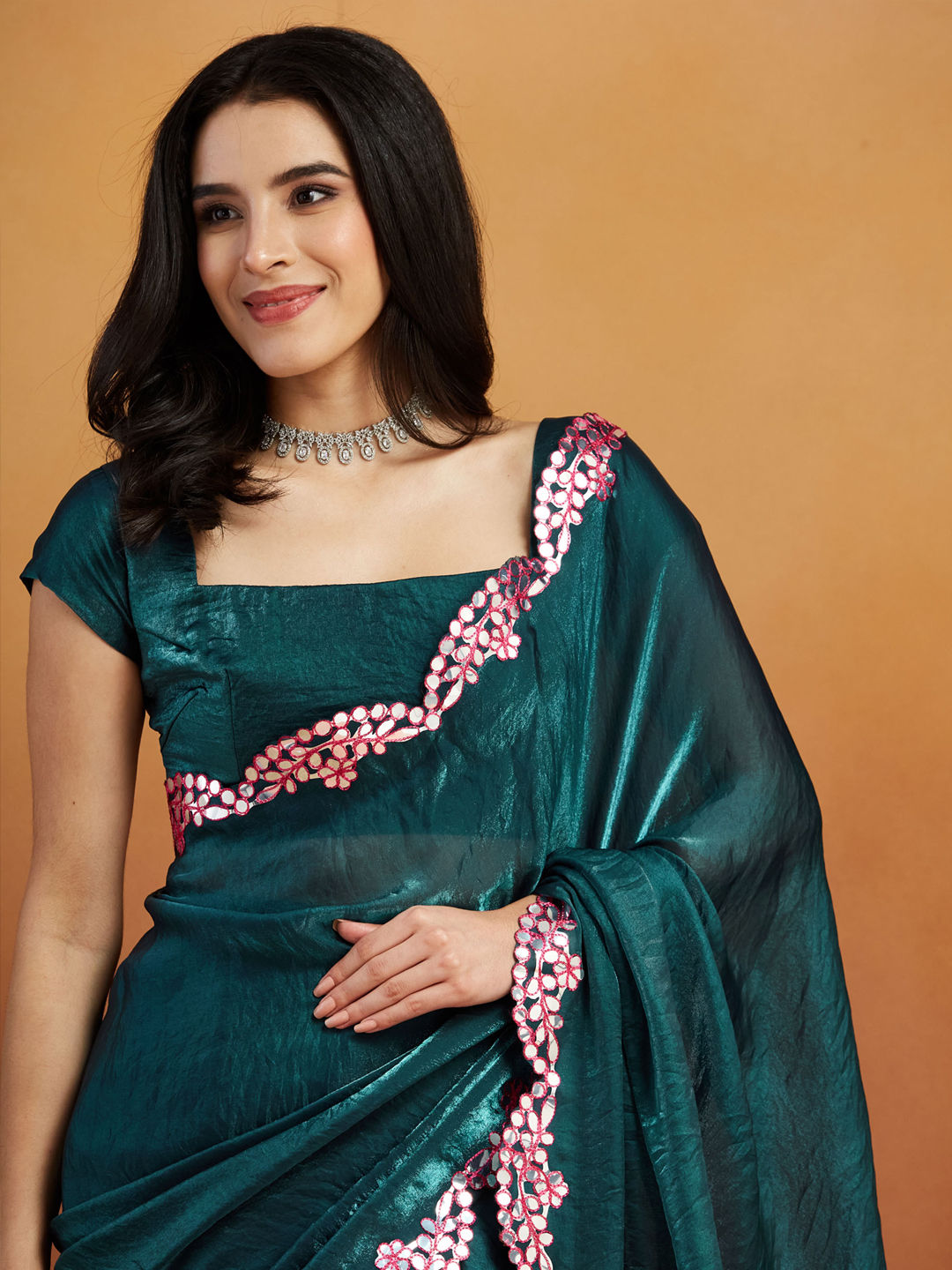 Satin Silk Reception Readymade Saree in Green with Mirror work