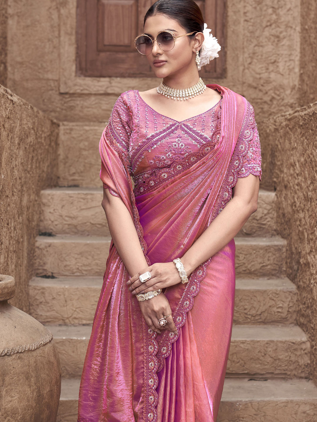 Pink and Majenta color Readymade Saree in Satin Silk fabric with Border, Bugle Beads, Embroidered, Sequence, Thread work