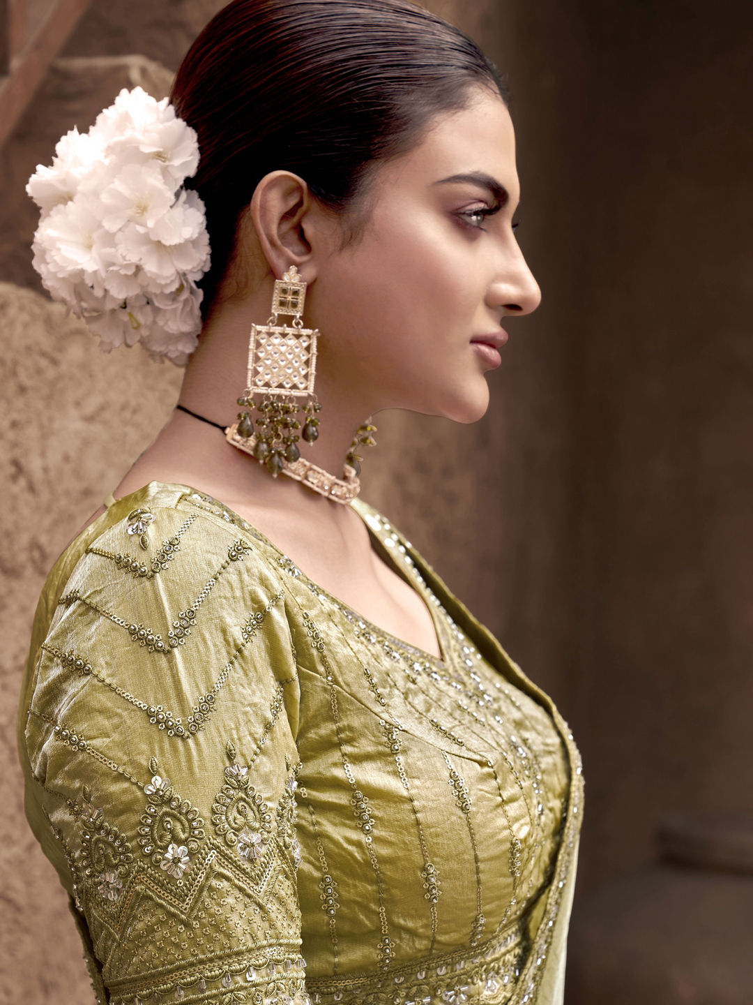 Satin Silk Traditional Readymade Saree in Beige and Brown with Bugle Beads work