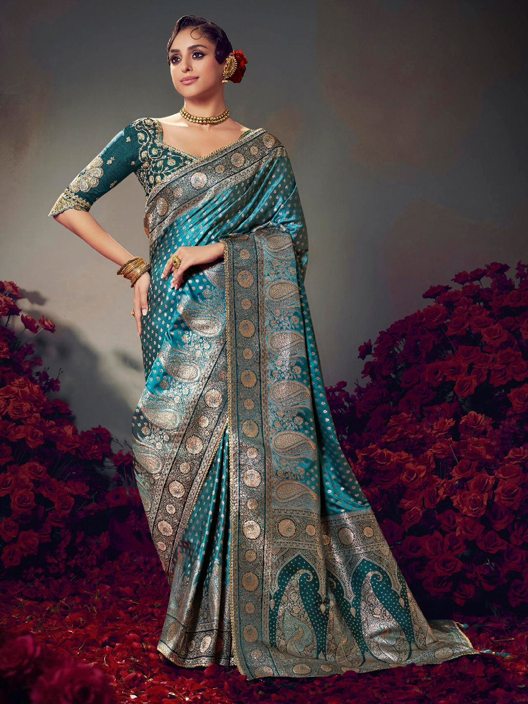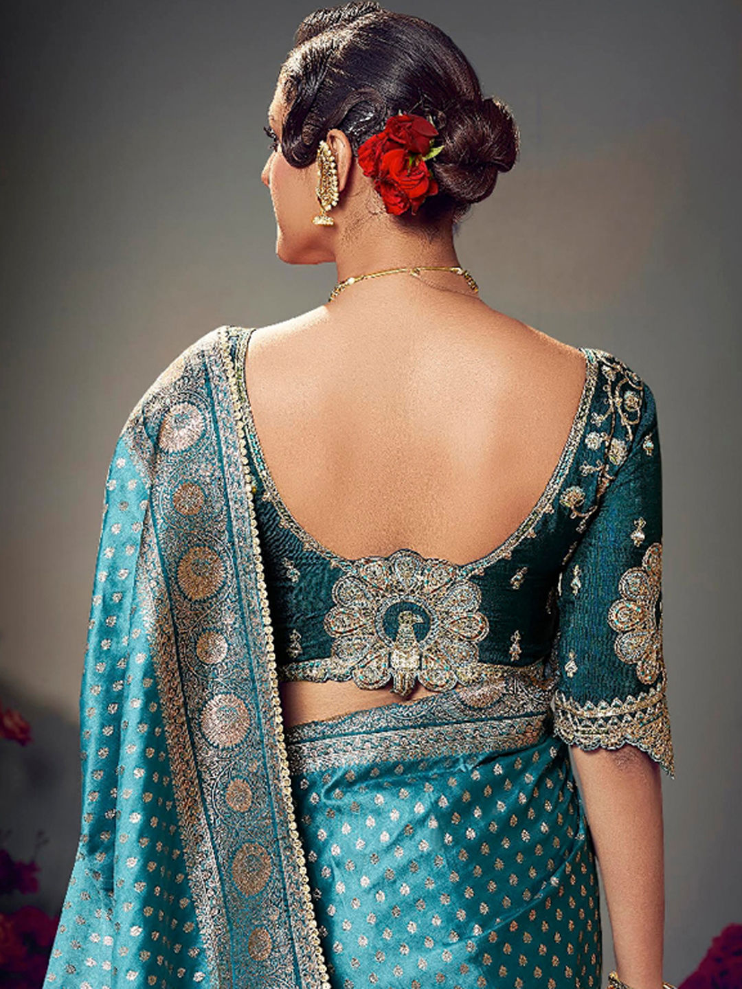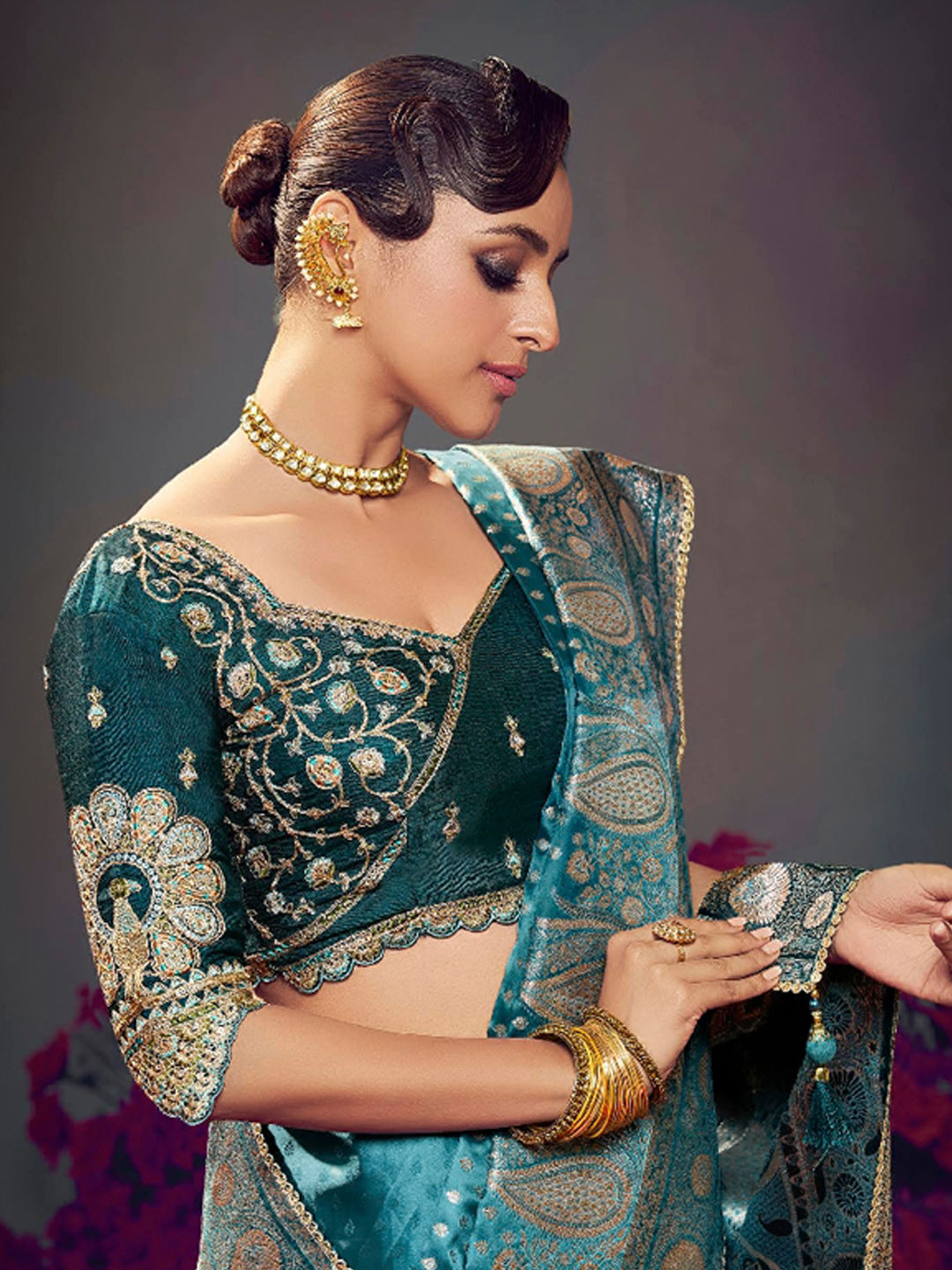 Blue color Saree in Satin Silk fabric with Lace, Weaving work