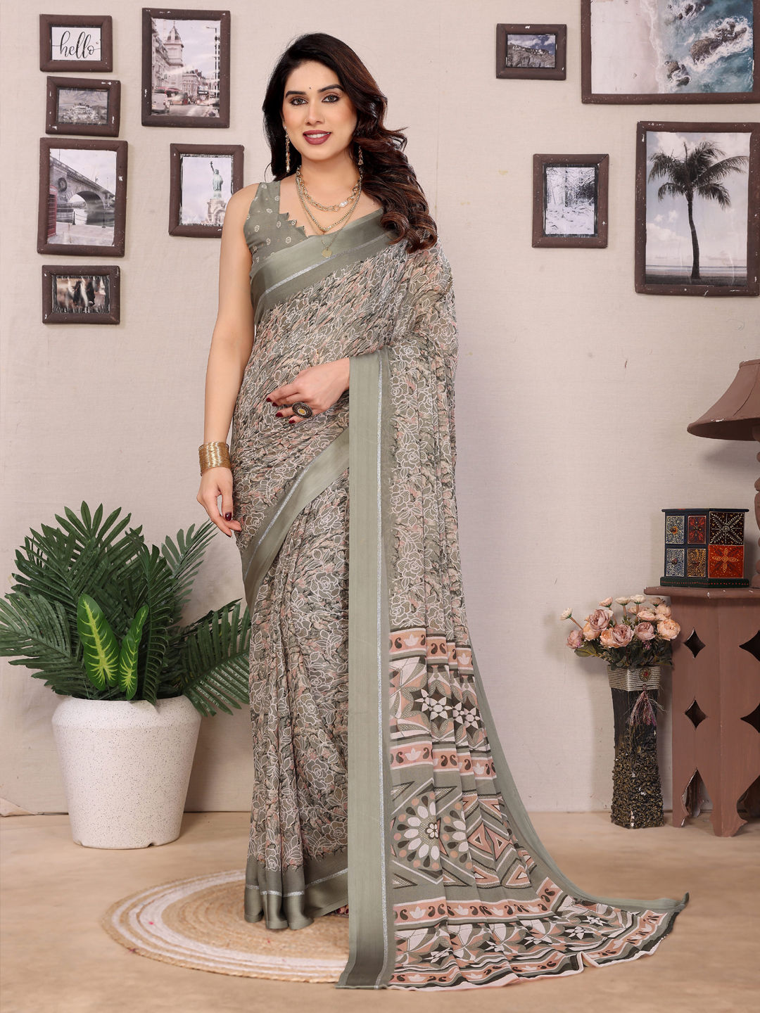 Satin Silk Festive Saree in Black and Grey with Printed work