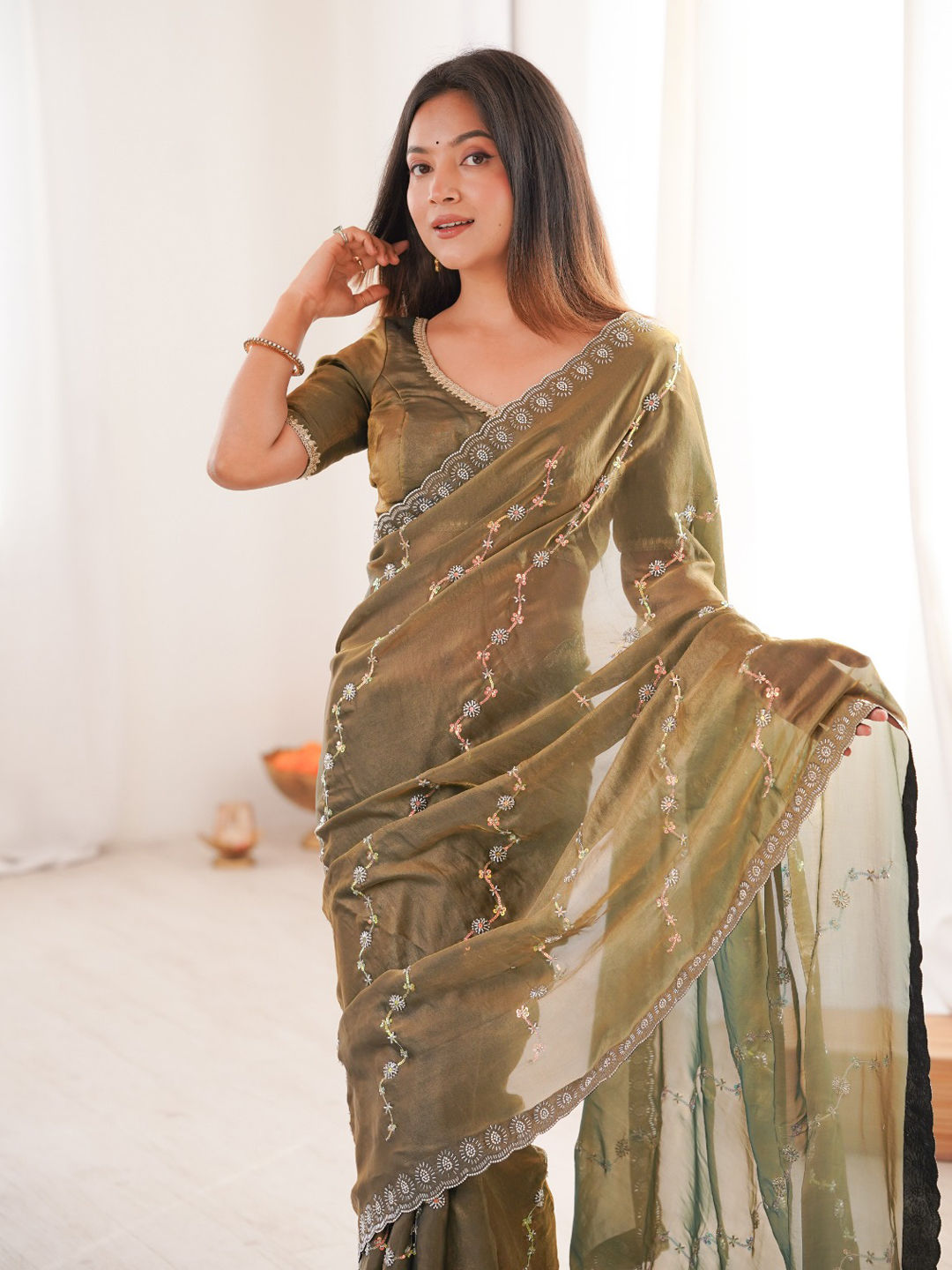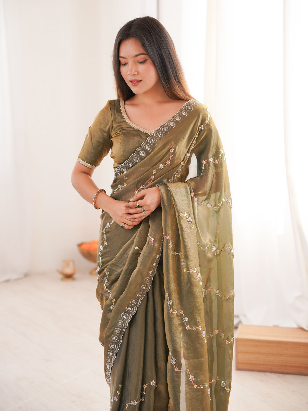 Green color Saree in Satin Silk fabric with Bugle Beads, Embroidered work