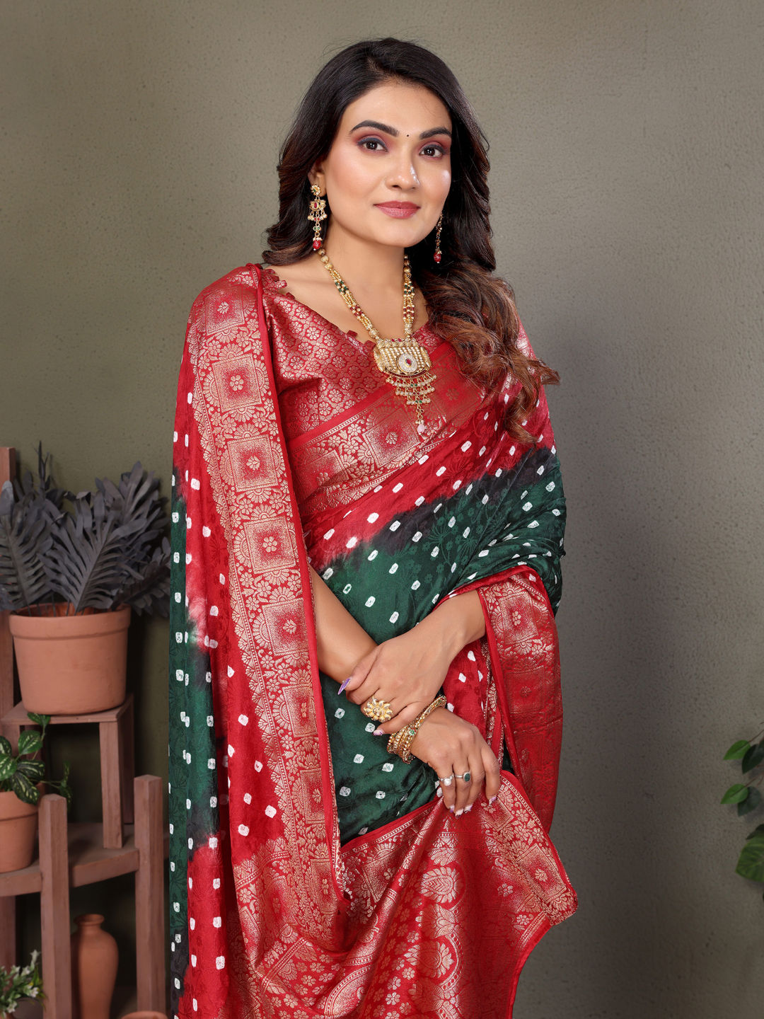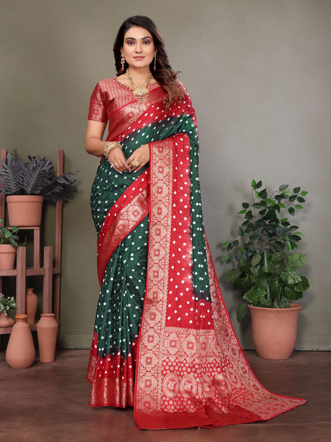 Green color Saree in Satin Silk fabric with Bandhej, Printed work