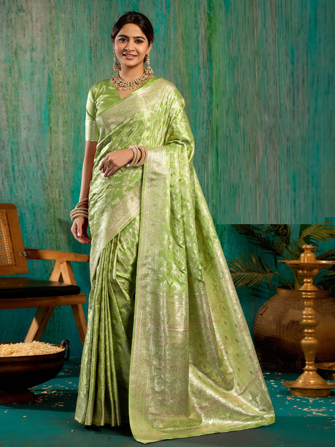 Satin Silk Traditional Saree in Green with Weaving work