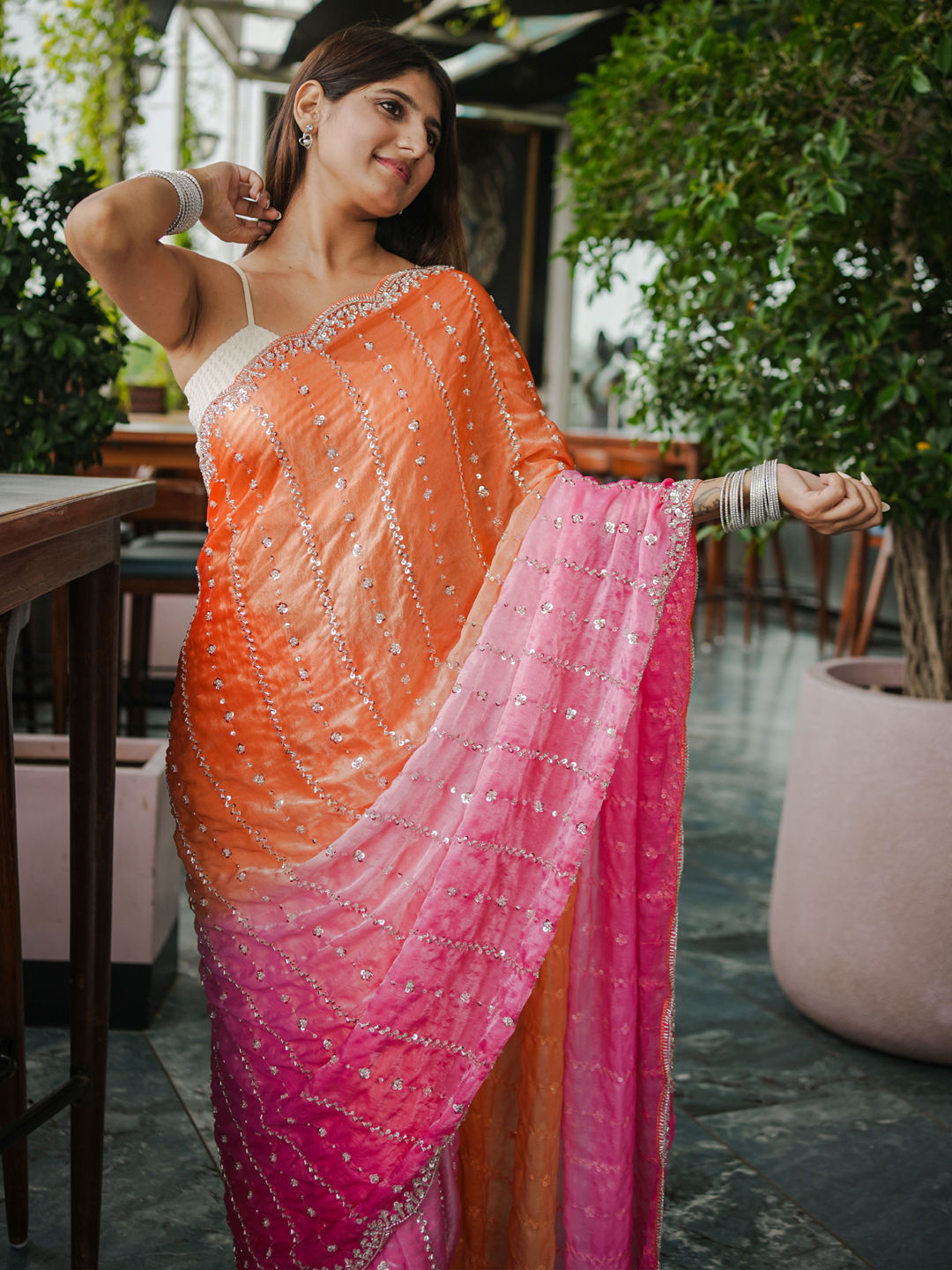 Orange color Saree in Satin Silk fabric with Bugle Beads, Sequence work