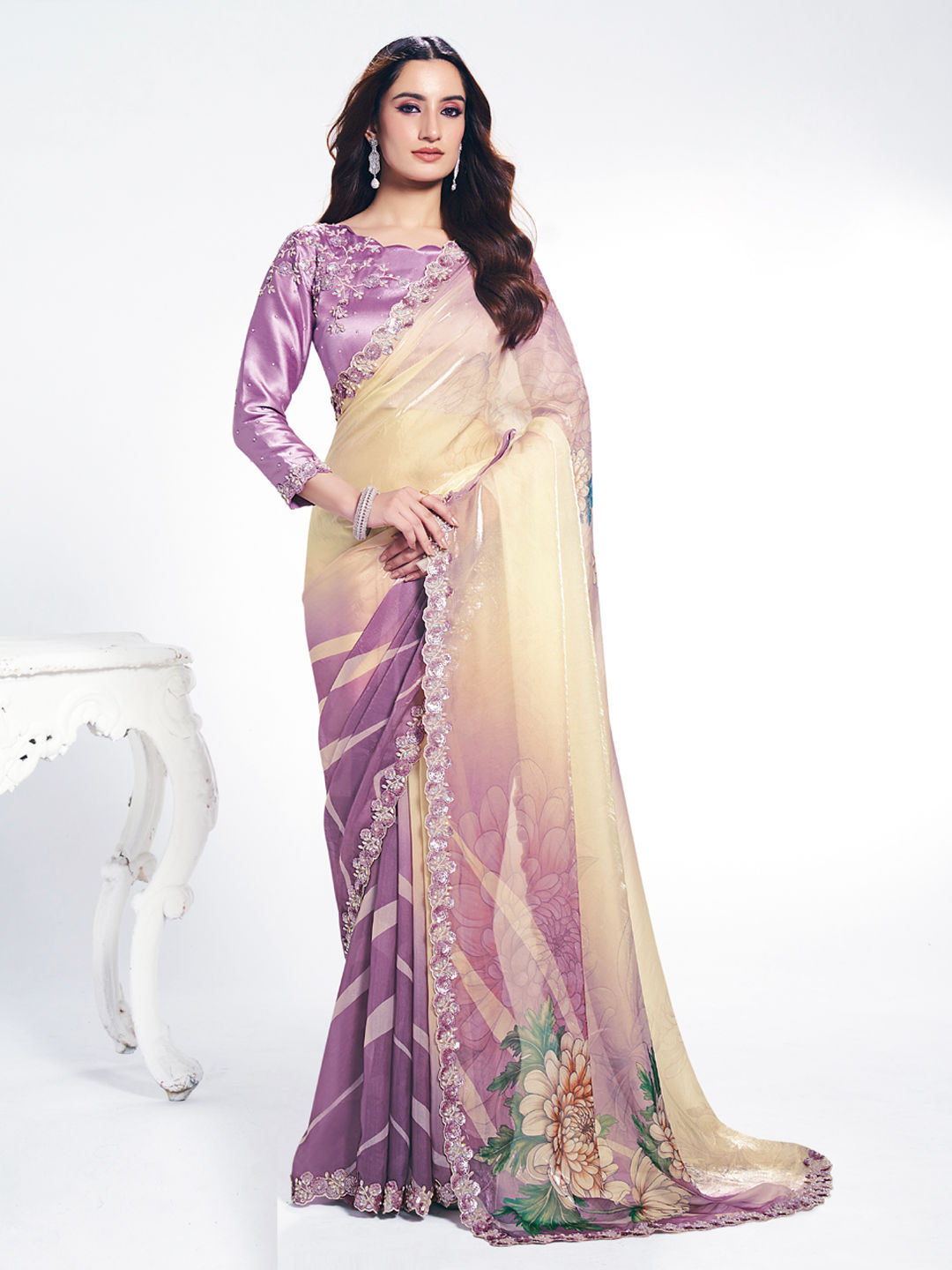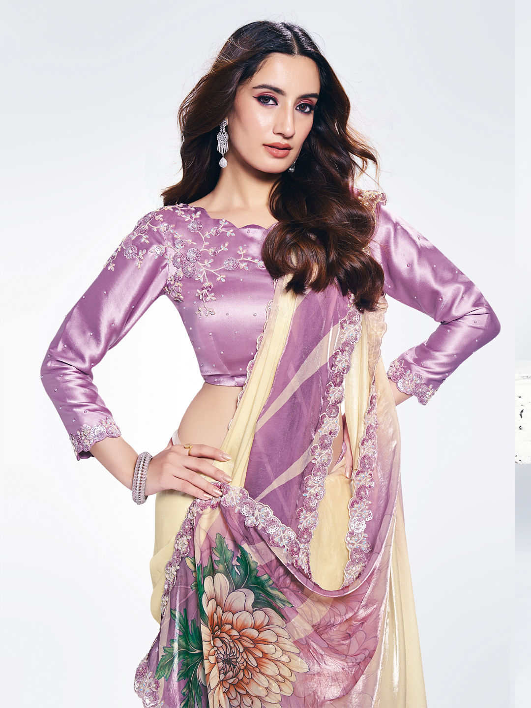Description: Beige and Brown, Purple and Violet color Saree in Satin Silk fabric with Digital Print, Embroidered, Floral, Sequence, Stone work