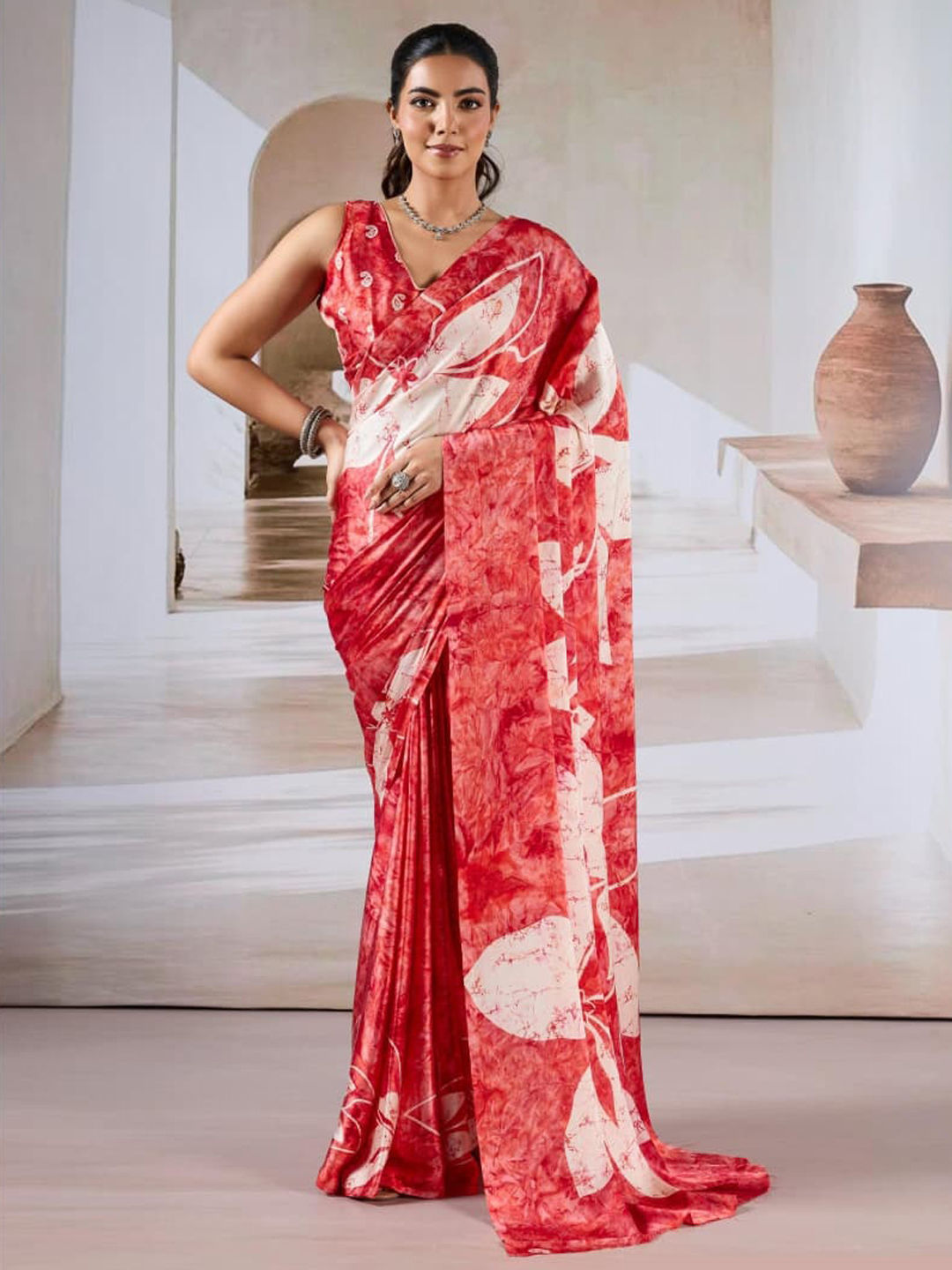 Red and Maroon color Saree in Satin Silk fabric with Printed work