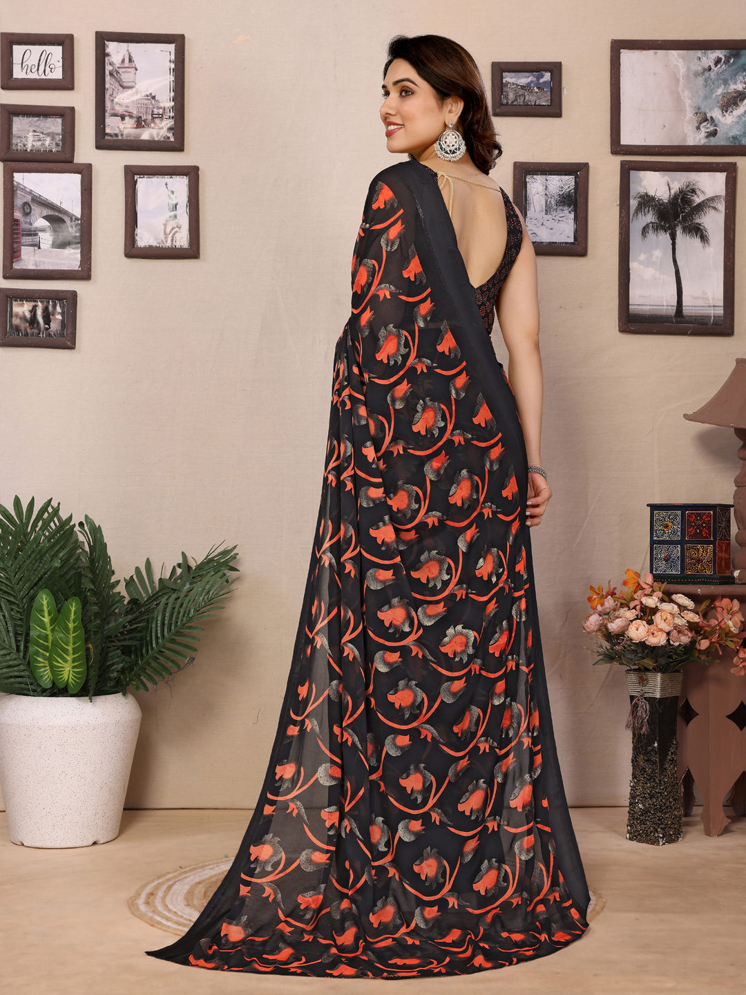 Satin Silk Festive Saree in Black and Grey with Printed work