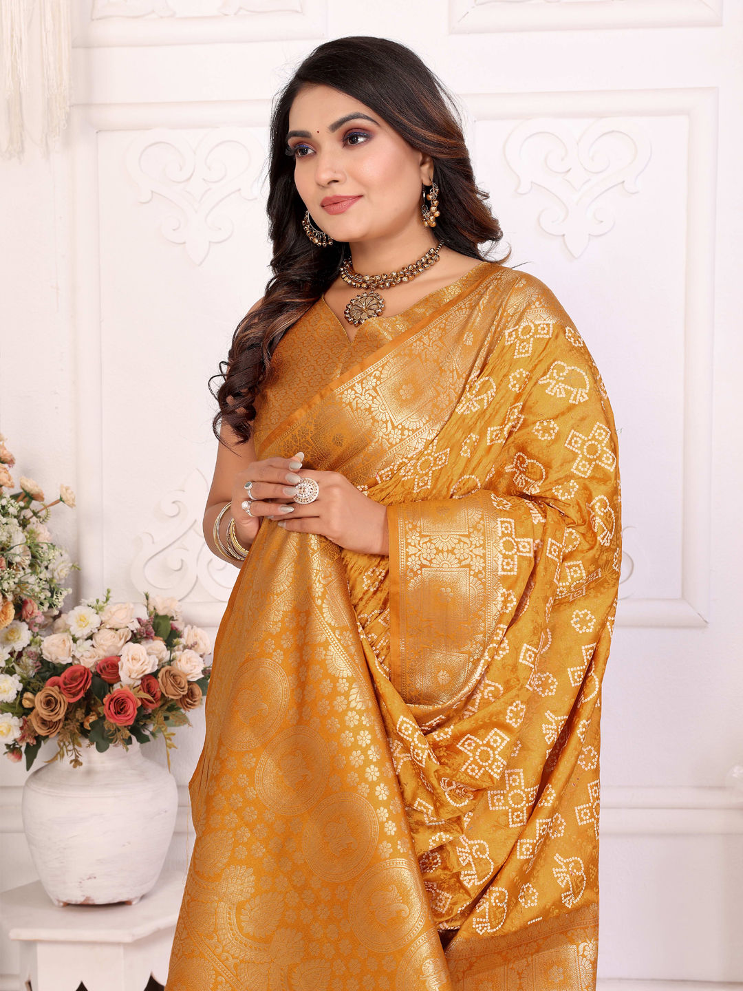 Yellow color Saree in Satin Silk fabric with Bandhej, Printed work