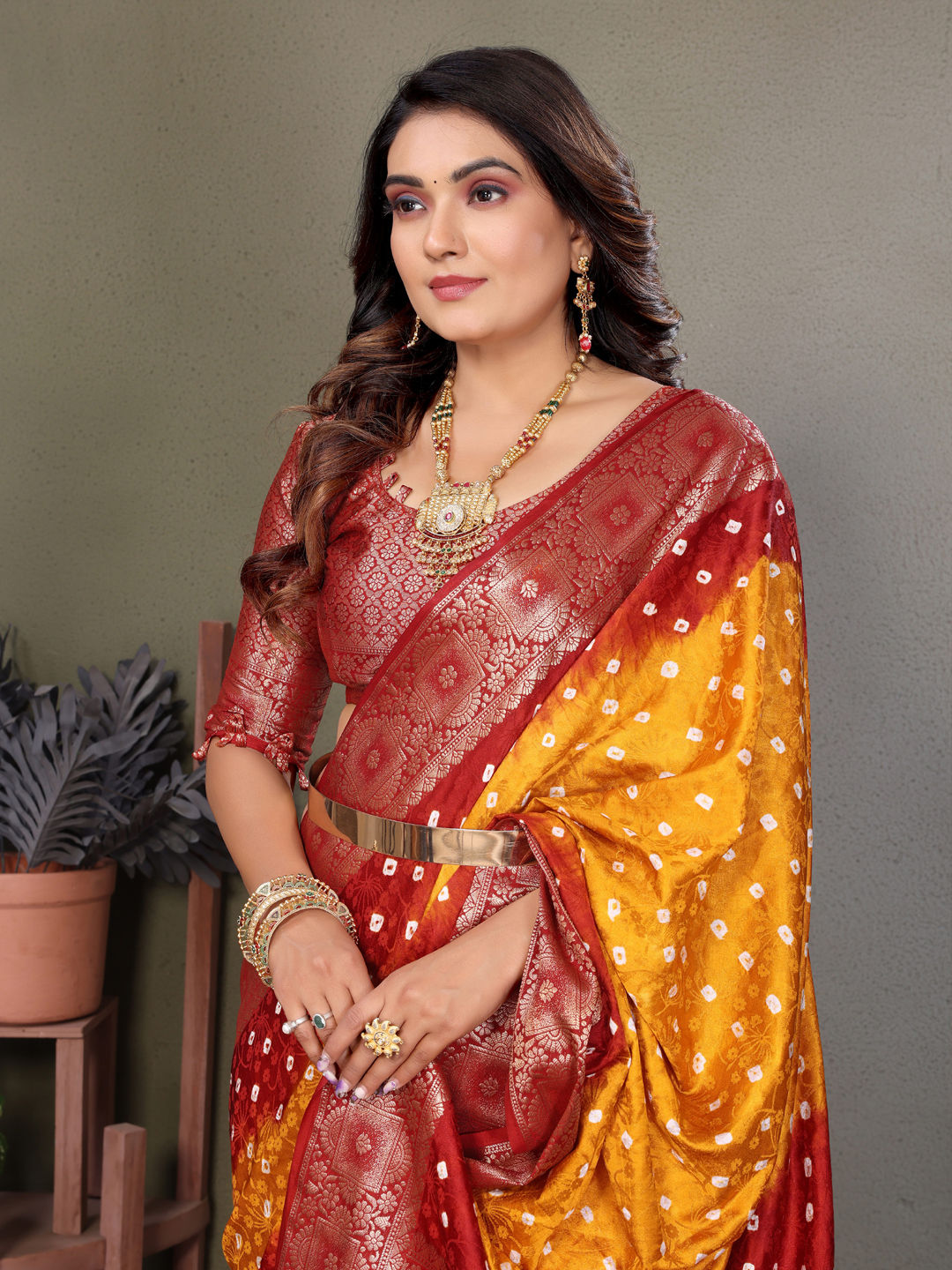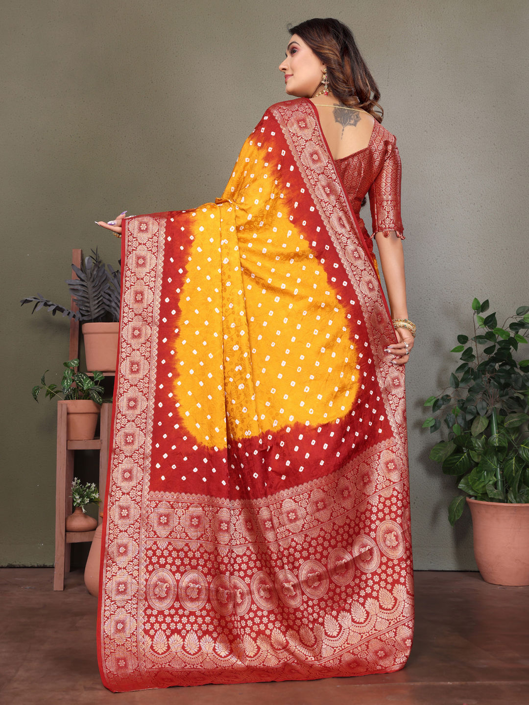 Yellow color Saree in Satin Silk fabric with Bandhej, Printed work