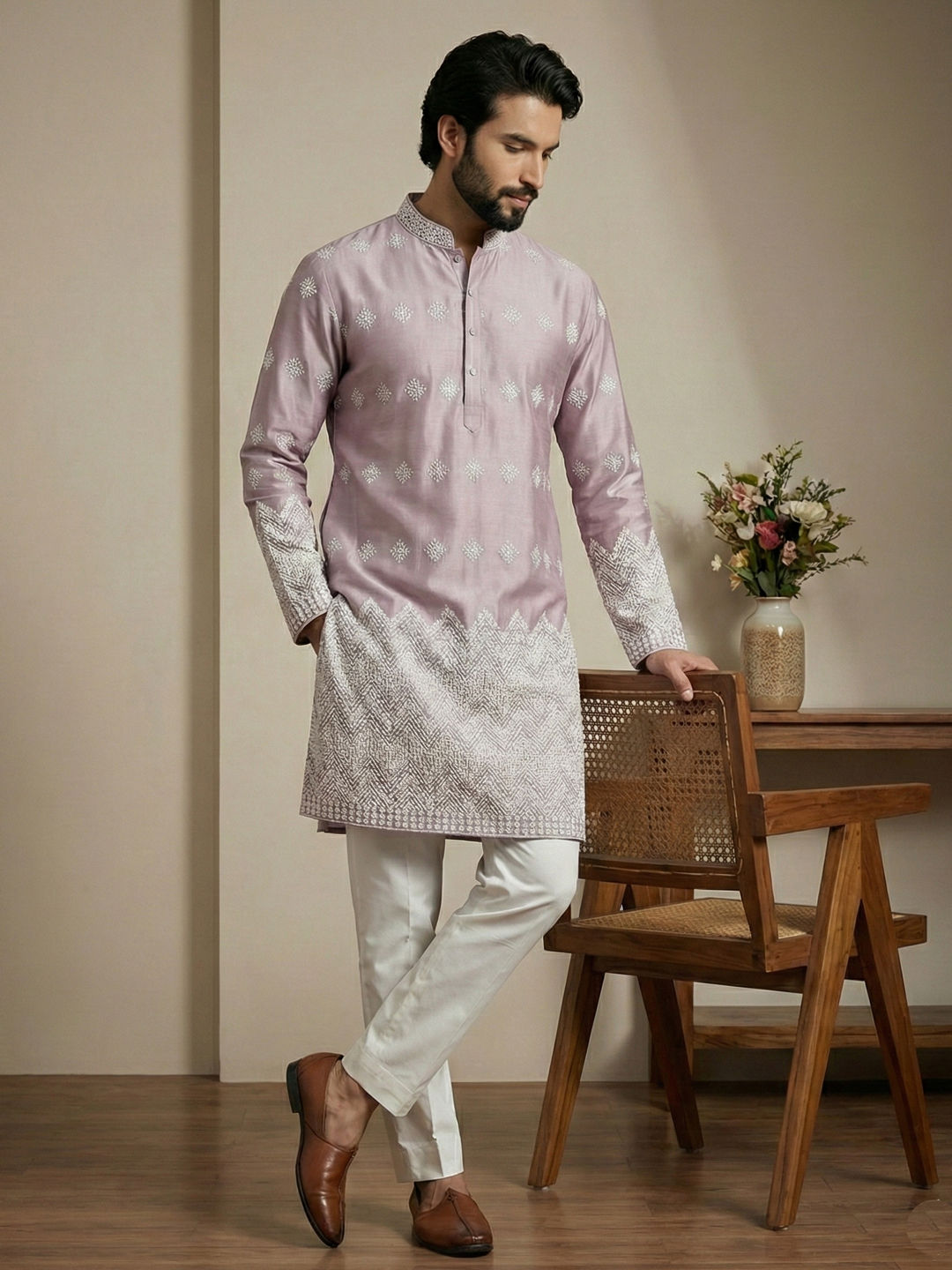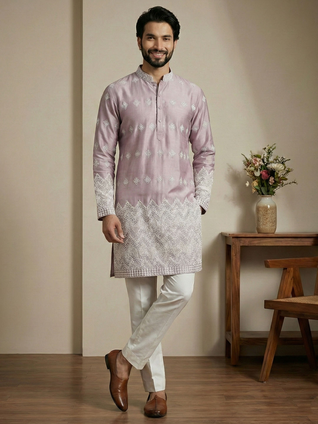 Satin Silk Festive Kurta Pyjamas in Pink and Majenta with Embroidered work