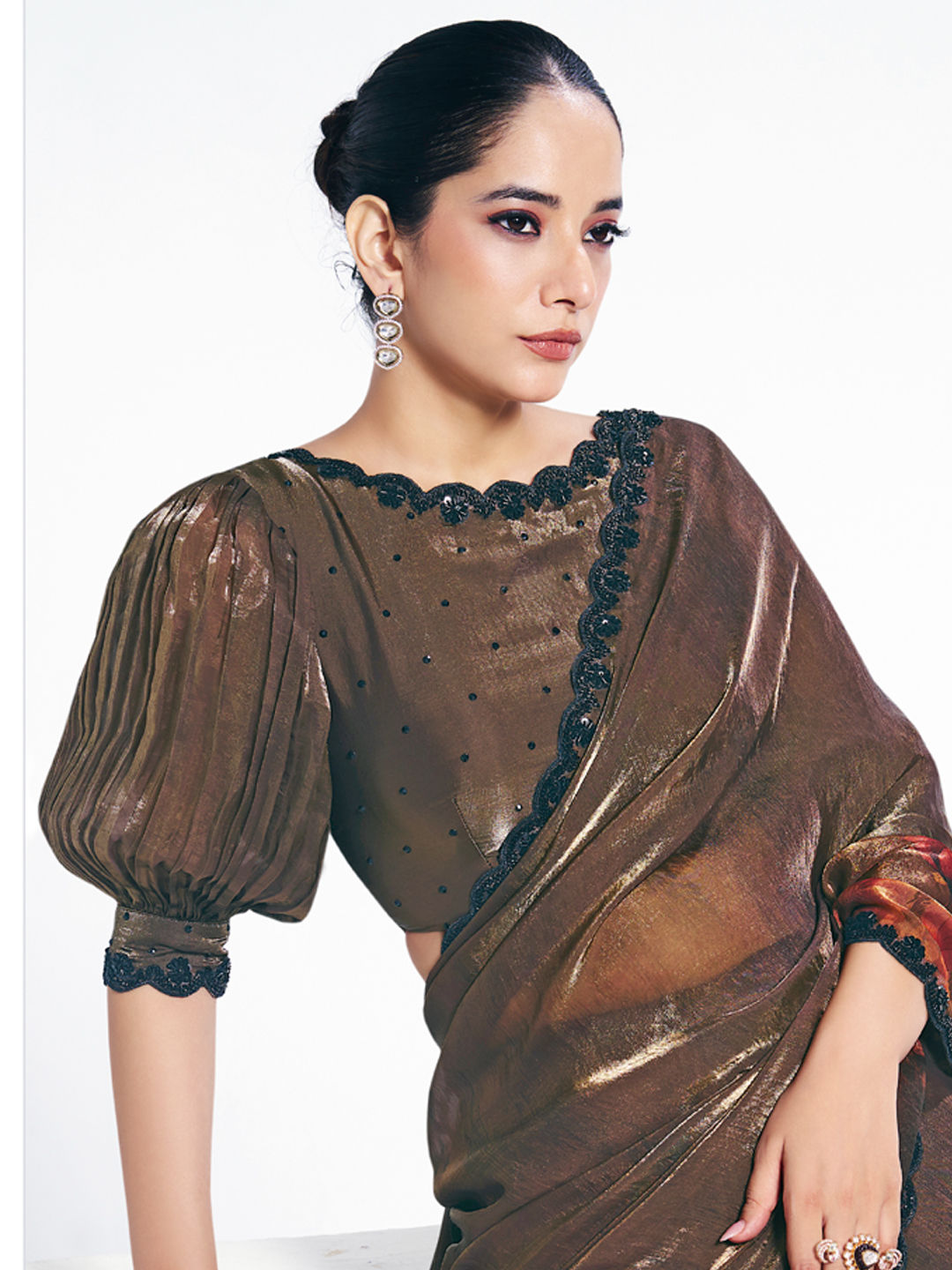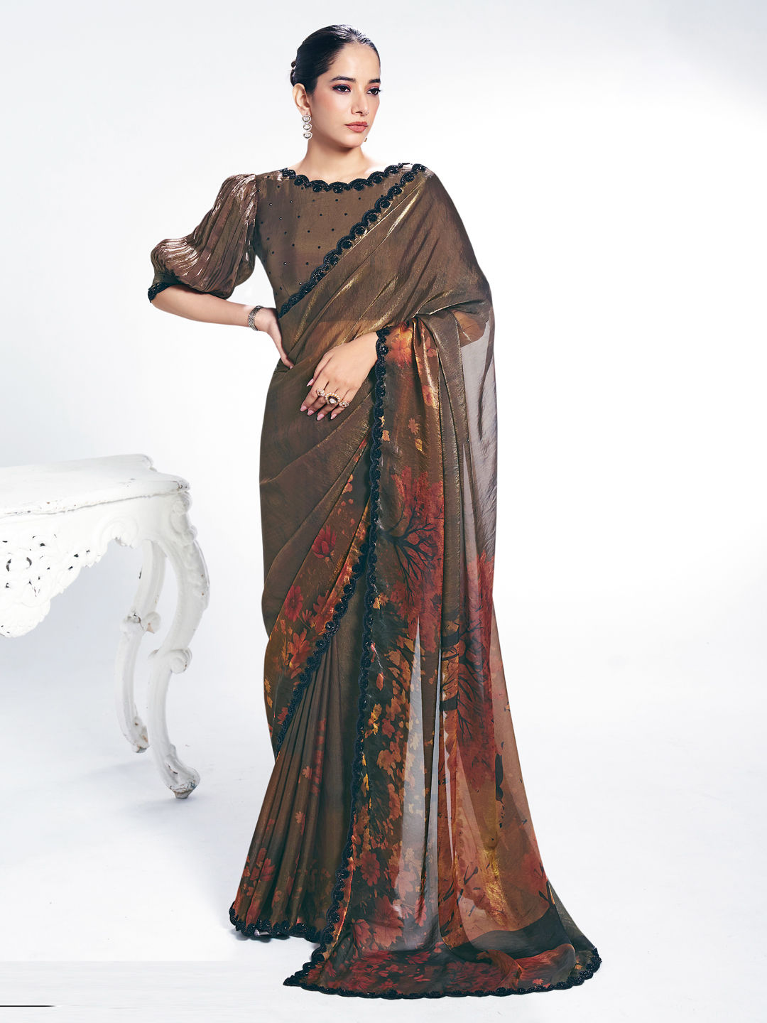 Beige and Brown color Saree in Satin Silk fabric with Bugle Beads, Digital Print, Embroidered work