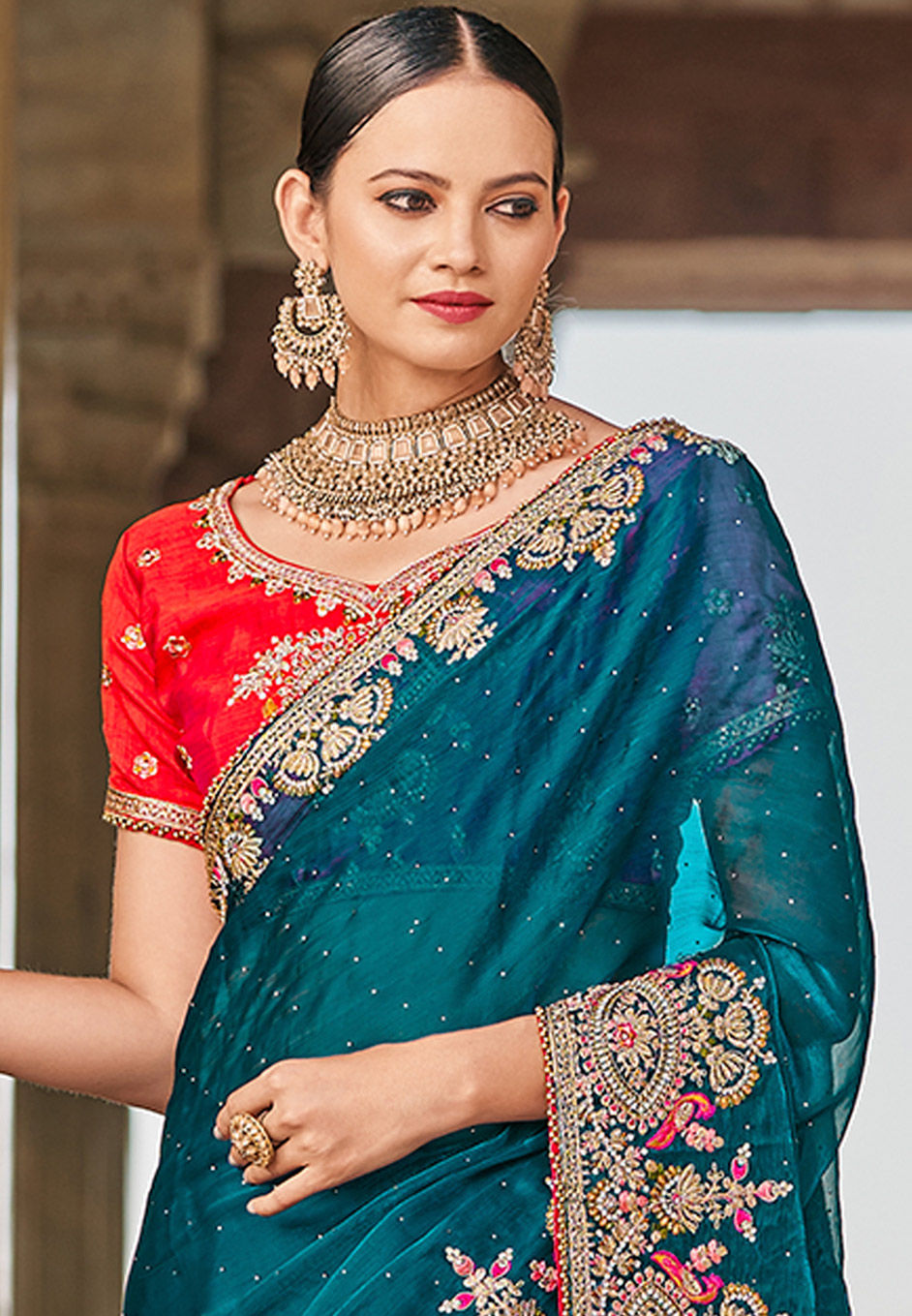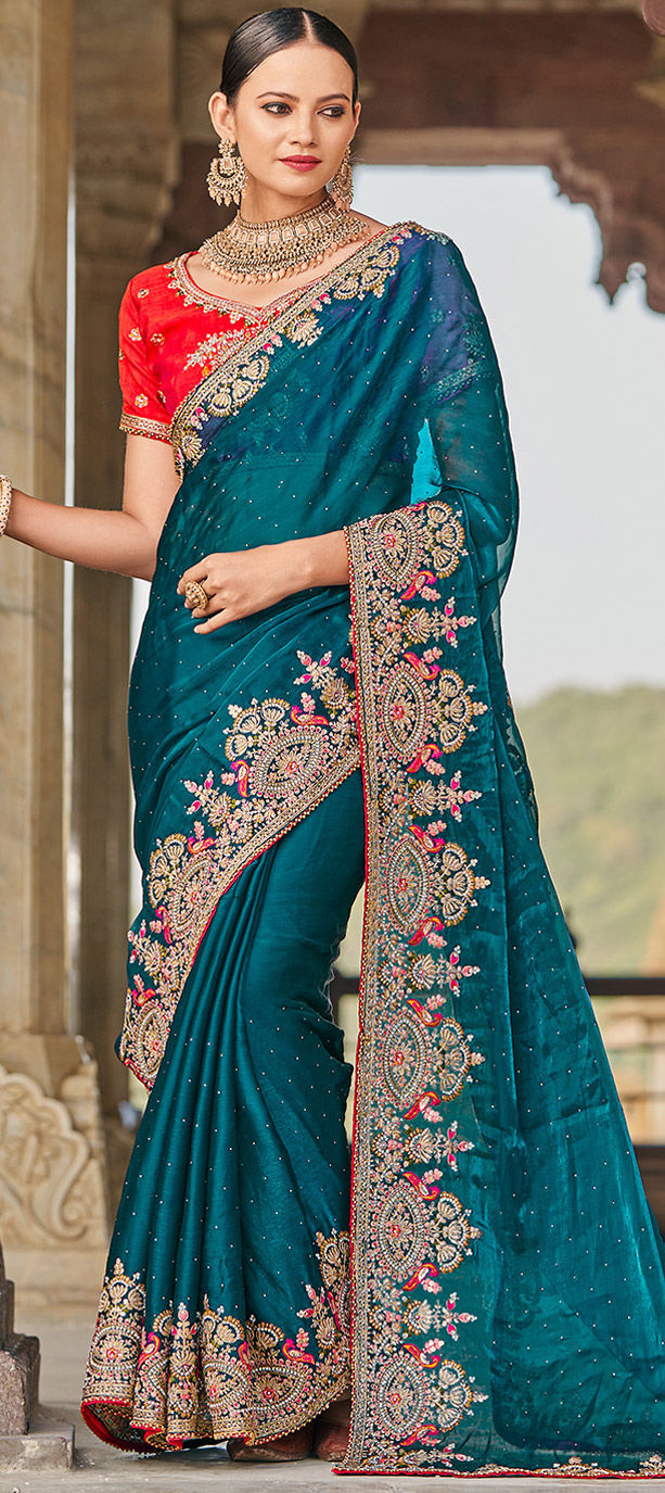 Blue color Saree in Satin Silk fabric with Embroidered, Stone, Thread work
