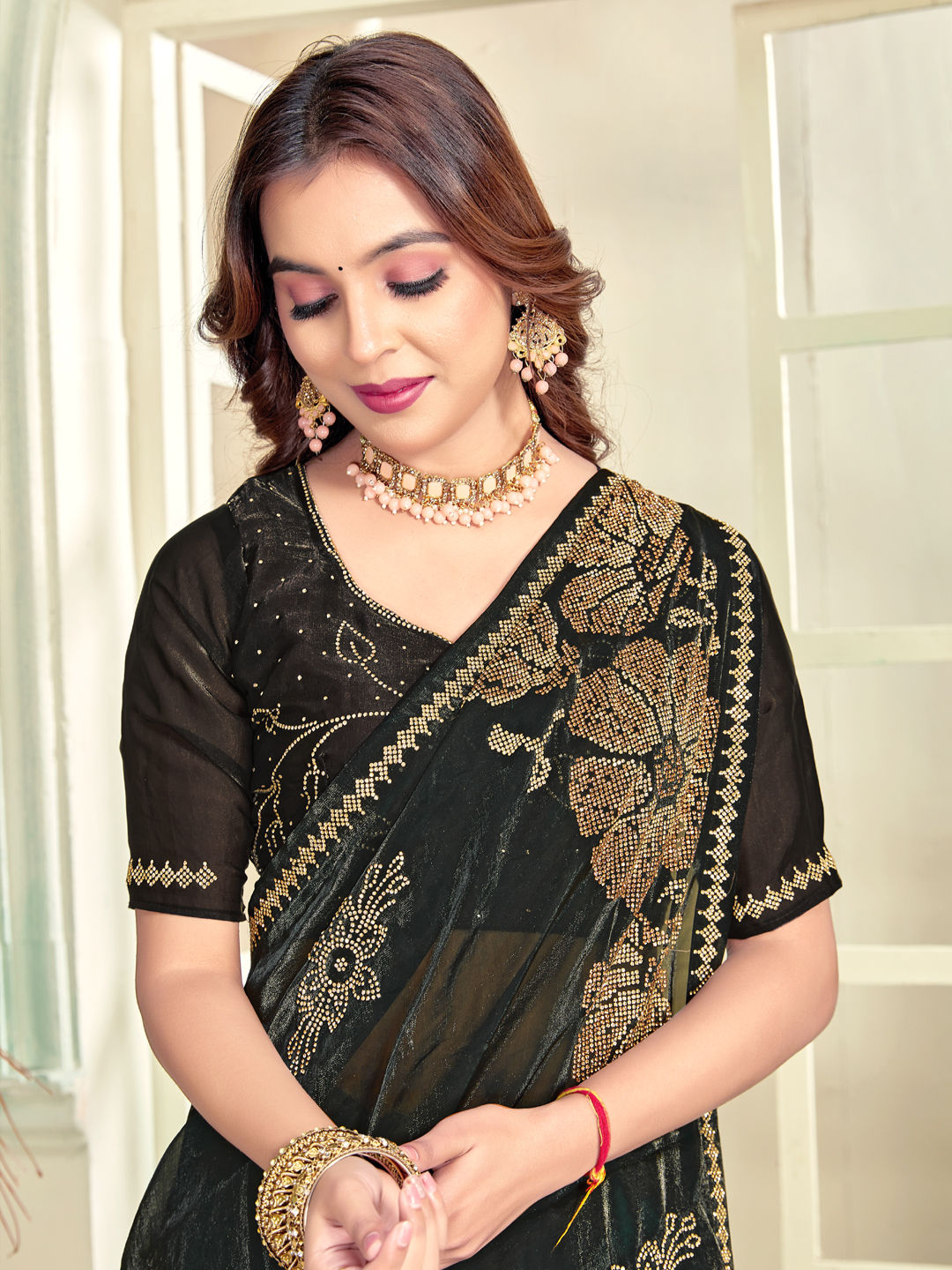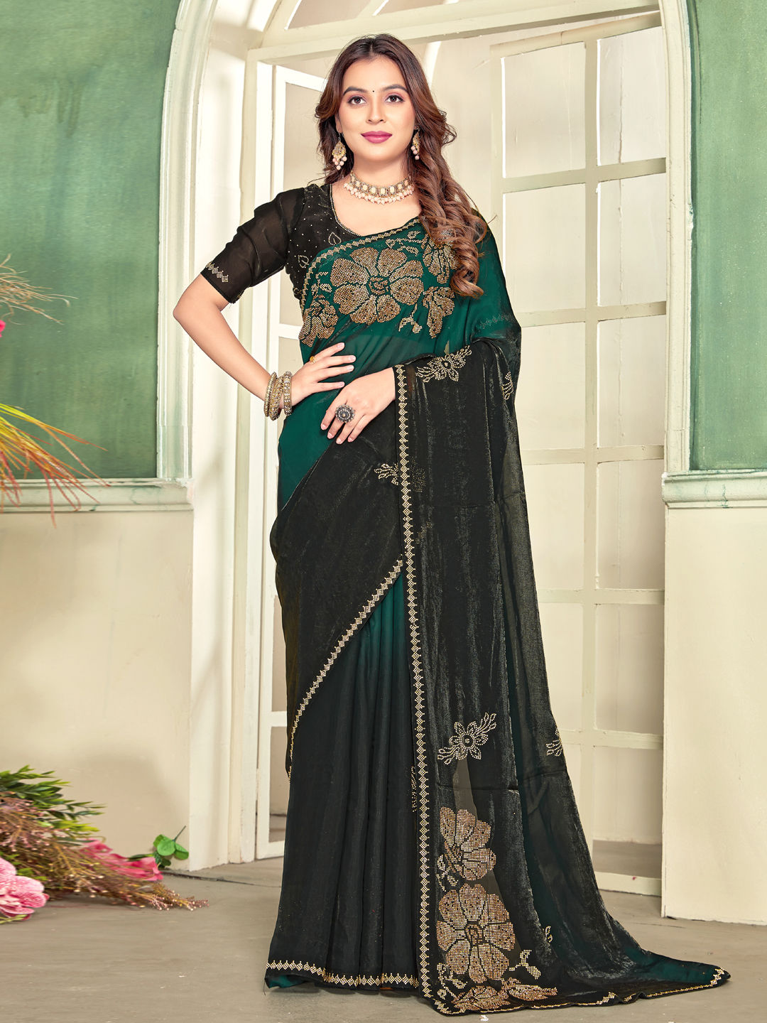 Green color Saree in Satin Silk fabric with Thread, Zircon work