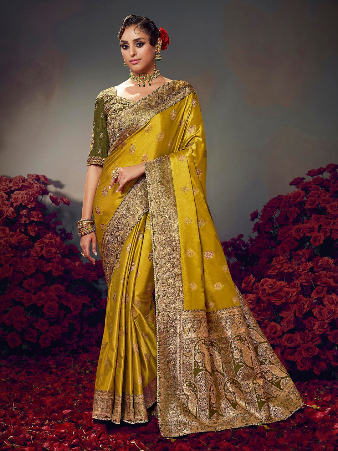 Satin Silk Wedding Saree in Yellow with Weaving work