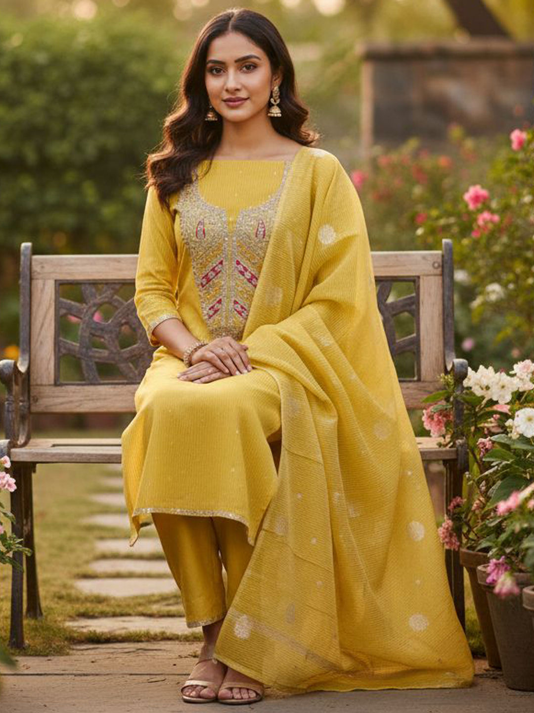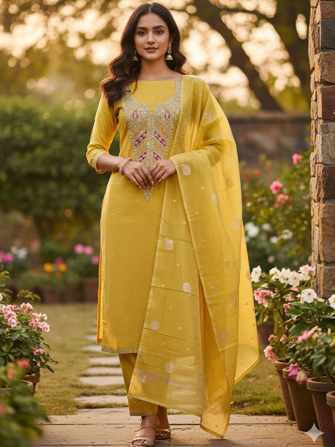 Yellow color Salwar Kameez in Shimmer fabric with Embroidered, Sequence work