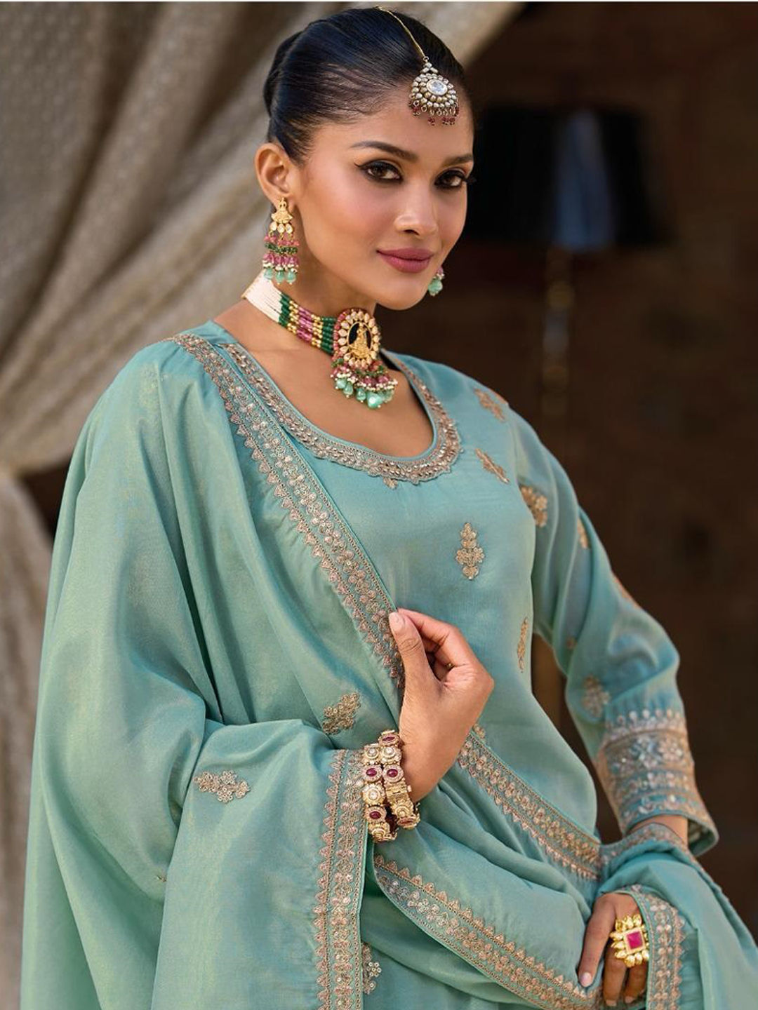 Blue color Salwar Kameez in Shimmer fabric with Embroidered, Thread work