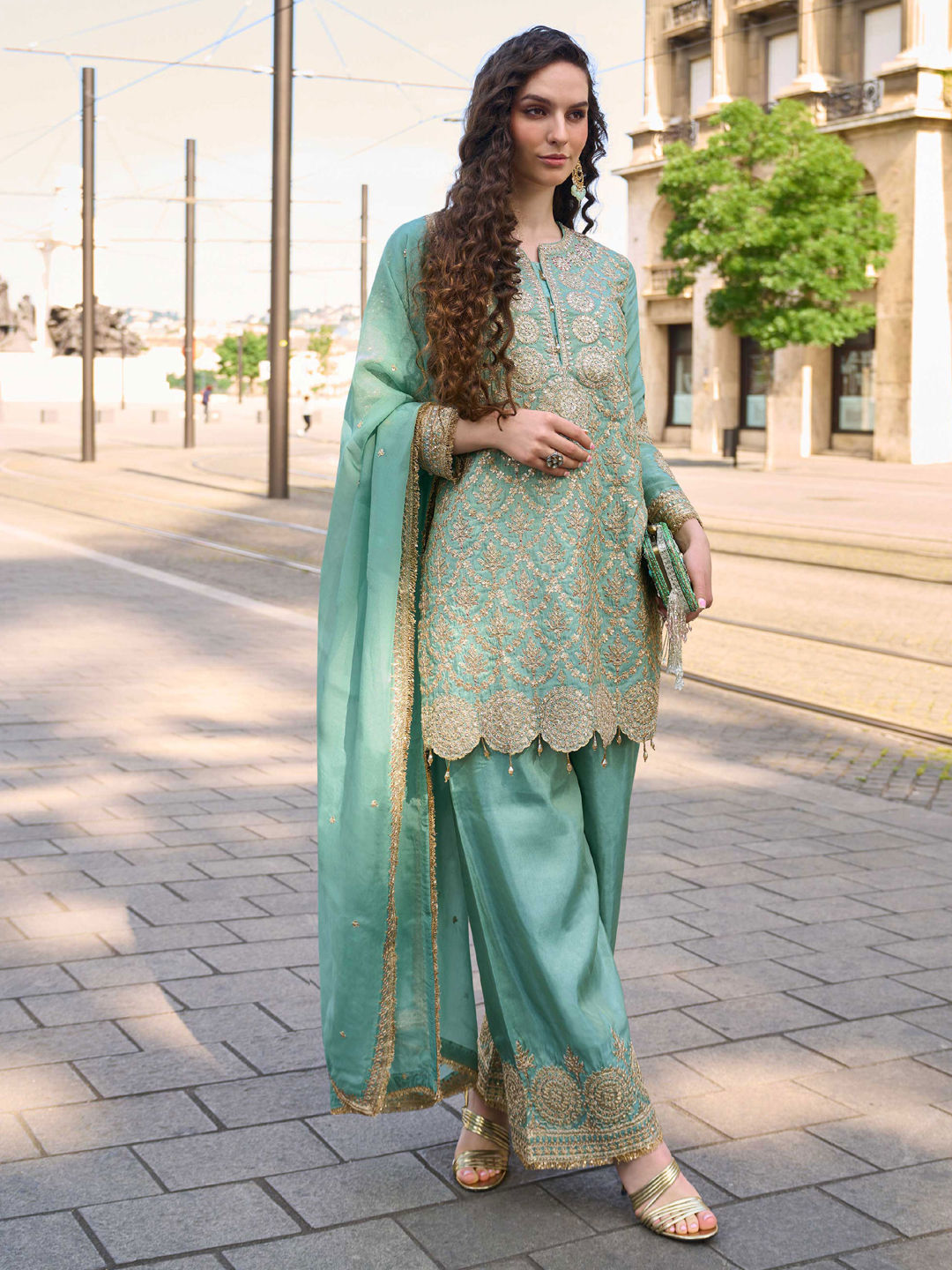 Green color Salwar Kameez in Shimmer fabric with Embroidered, Mirror, Sequence work