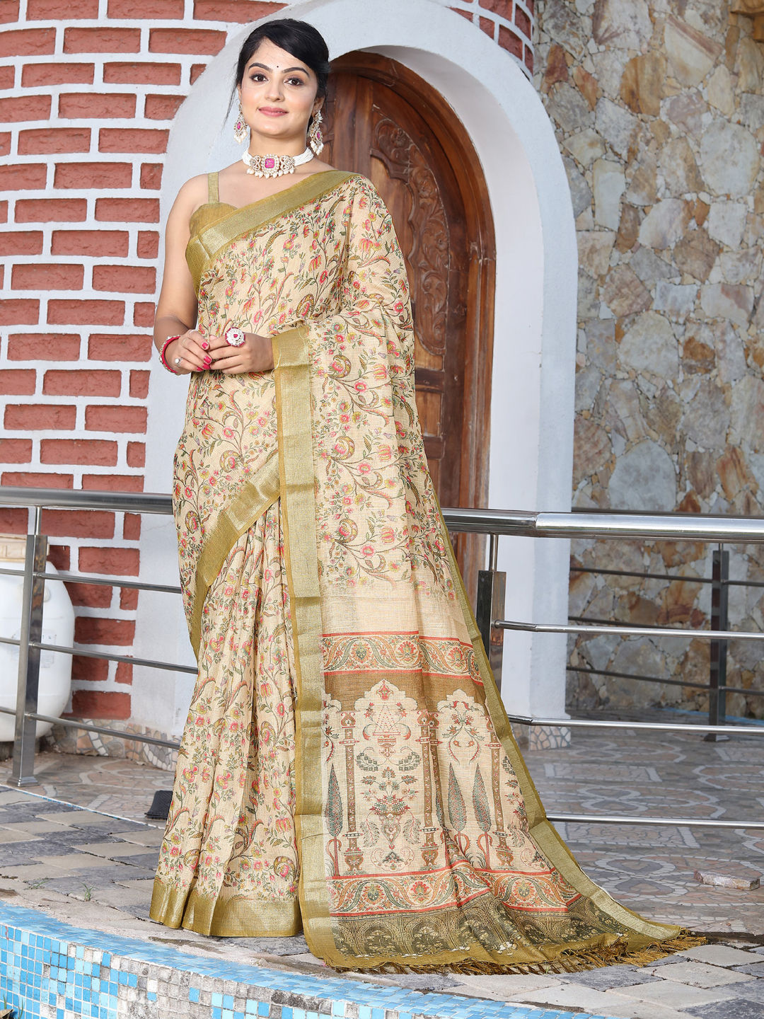 Beige and Brown color Saree in Cotton, Shimmer fabric with Floral, Printed, Weaving work