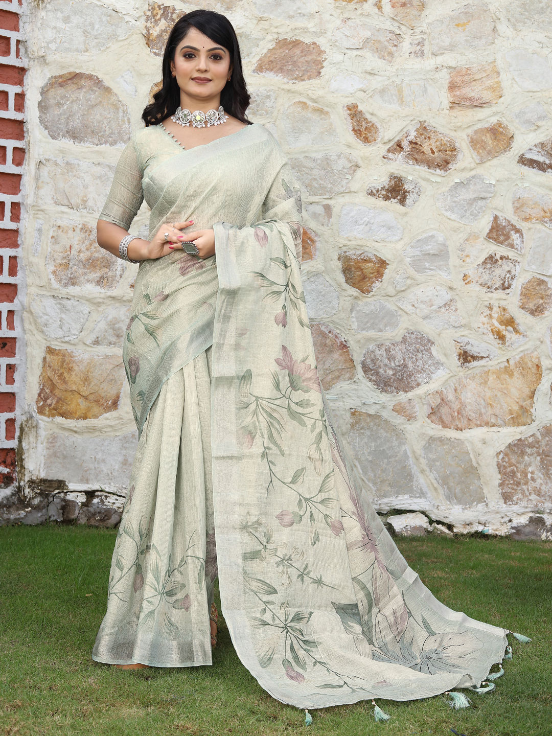 Black and Grey color Saree in Cotton, Shimmer fabric with Floral, Printed, Weaving work