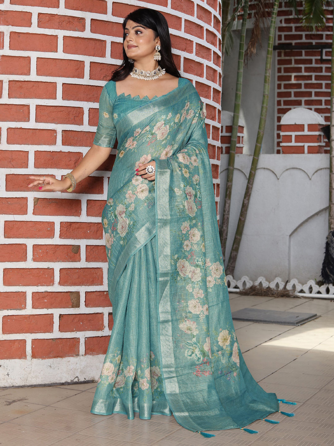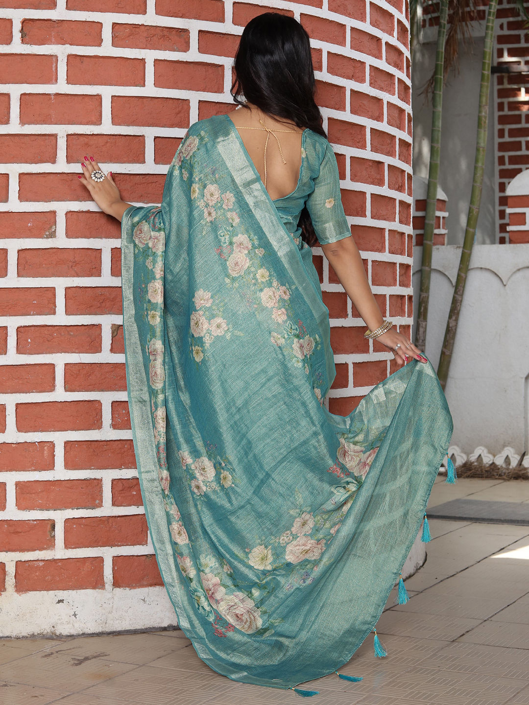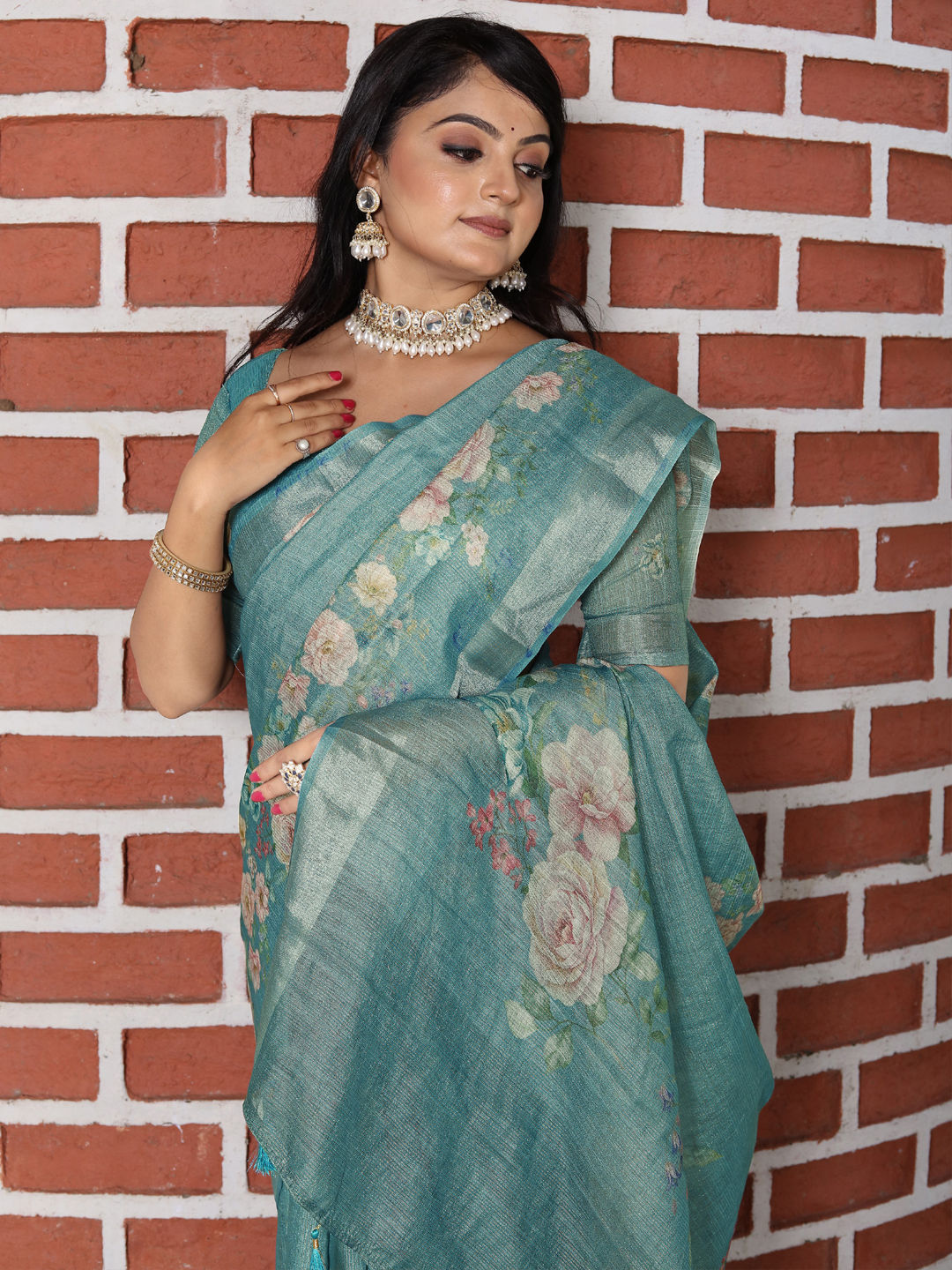 Green color Saree in Cotton, Shimmer fabric with Floral, Printed, Weaving work