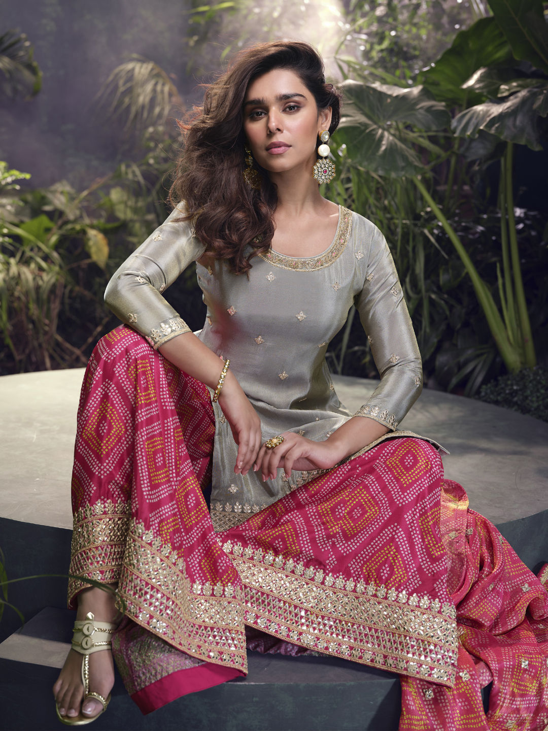 Description:  Black and Grey, Pink and Majenta color Salwar Kameez in Chinon Silk, Shimmer fabric with Bandhej, Embroidered, Printed, Sequence, Thread work