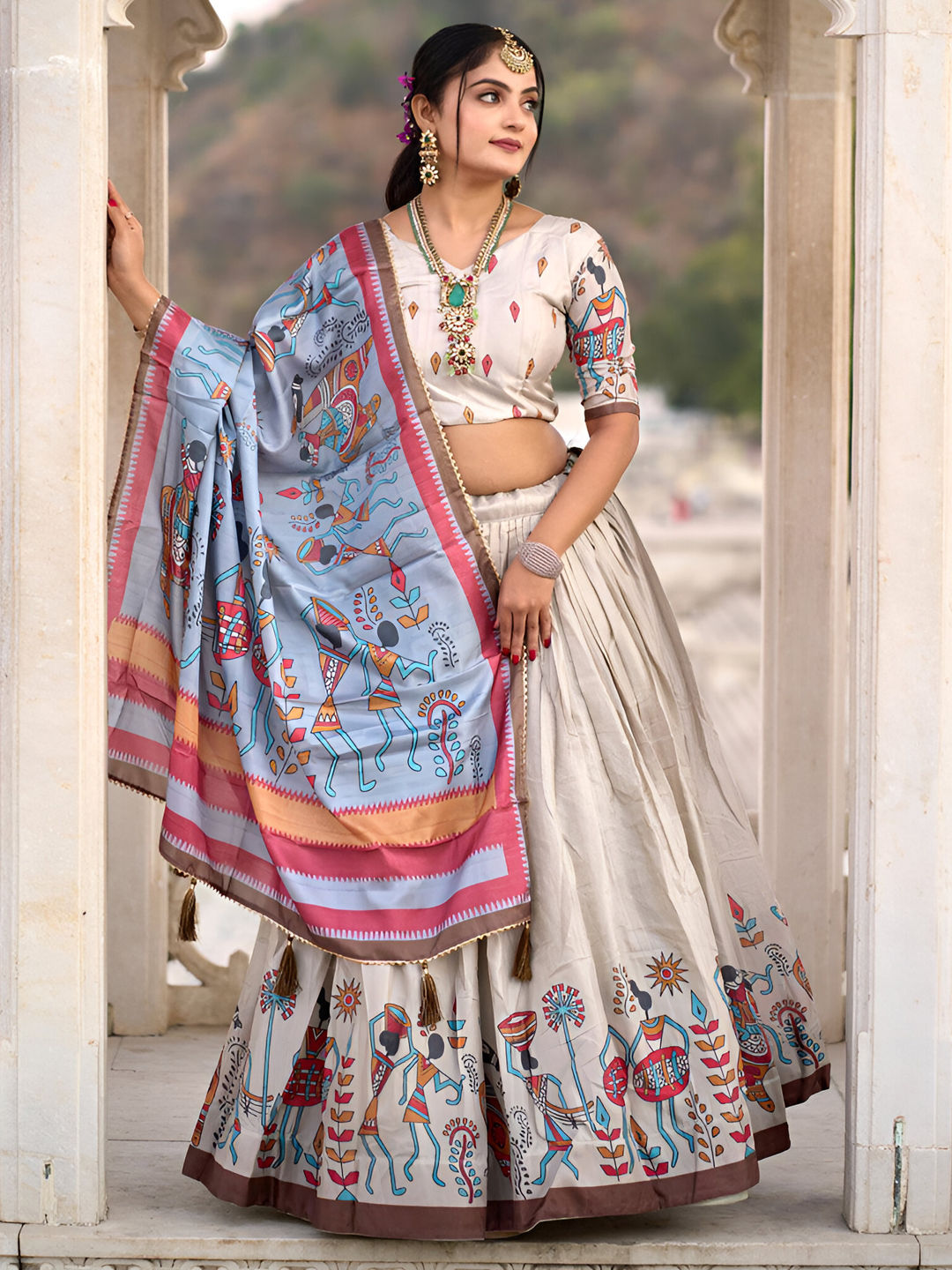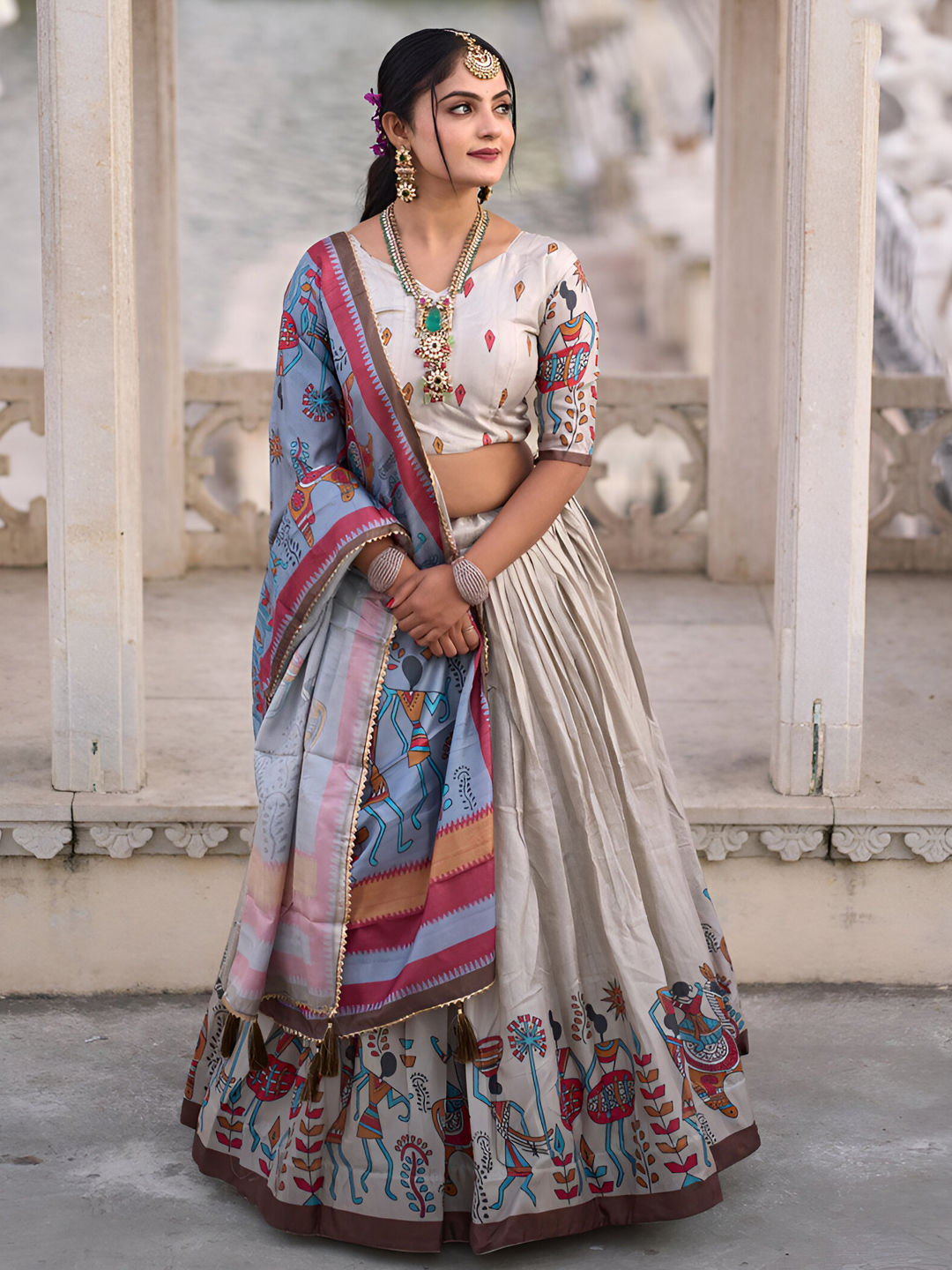 Beige and Brown color Lehenga in Silk fabric with Printed work