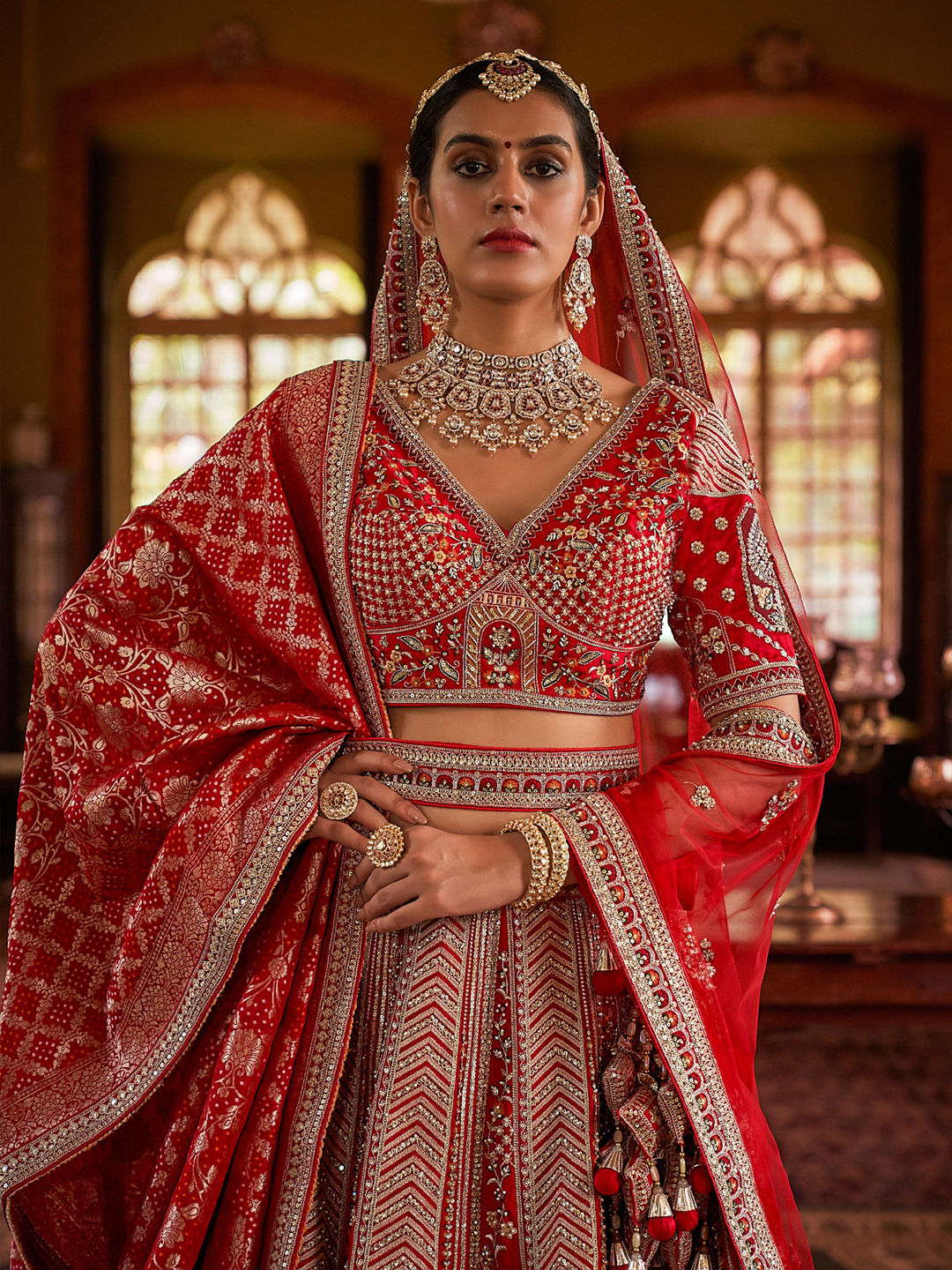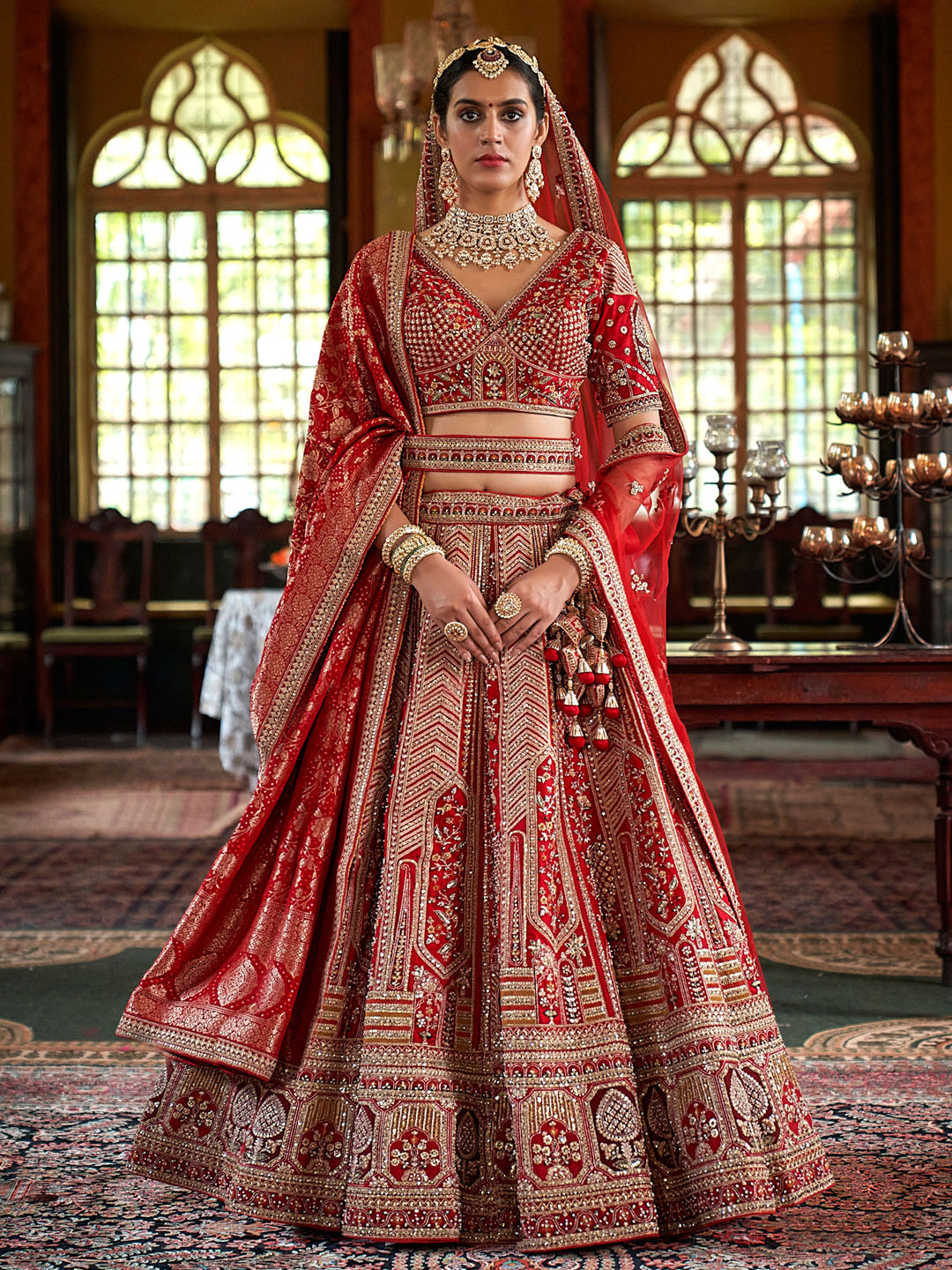 Silk Wedding Lehenga in Red and Maroon with Zari work