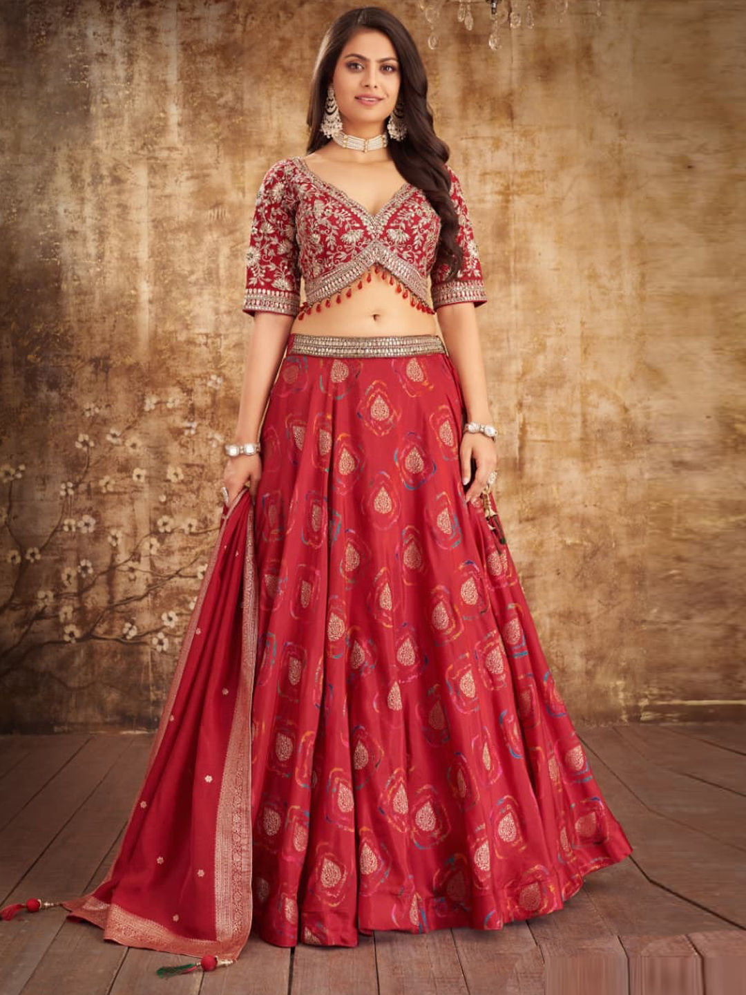 Red and Maroon color Lehenga in Silk fabric with Embroidered, Sequence work