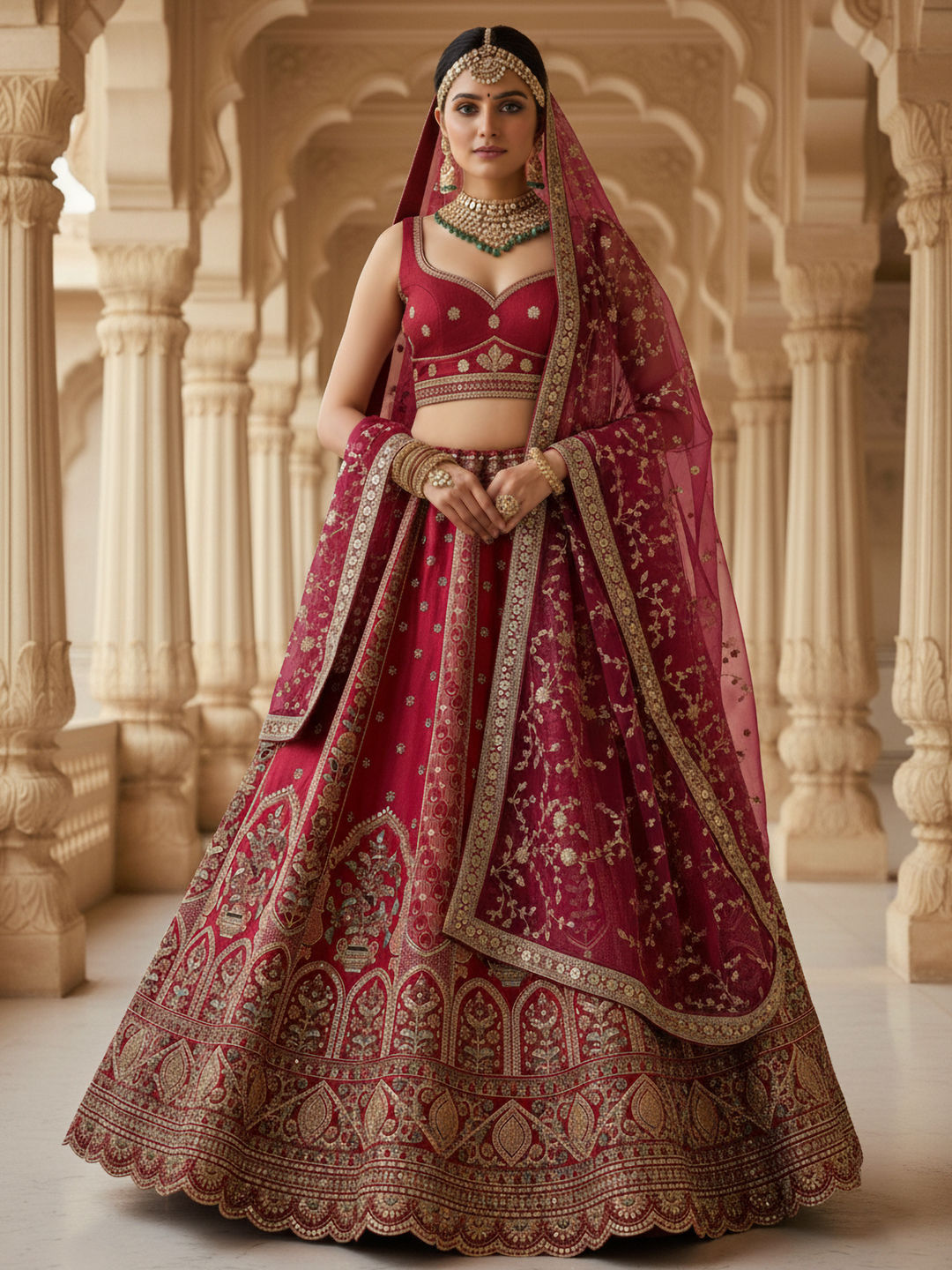 Red and Maroon color Lehenga in Silk fabric with Embroidered, Lace, Sequence, Thread, Zari work
