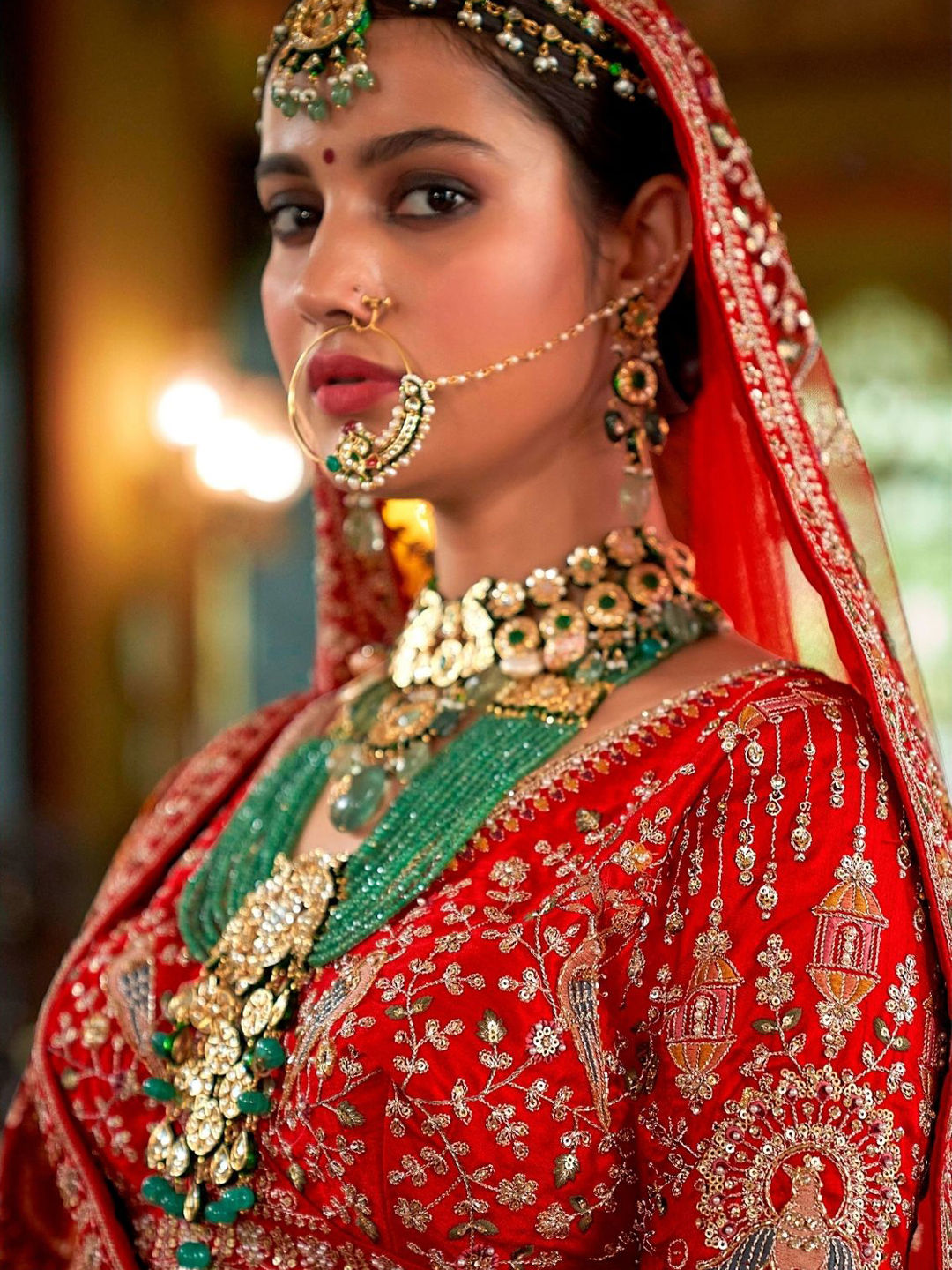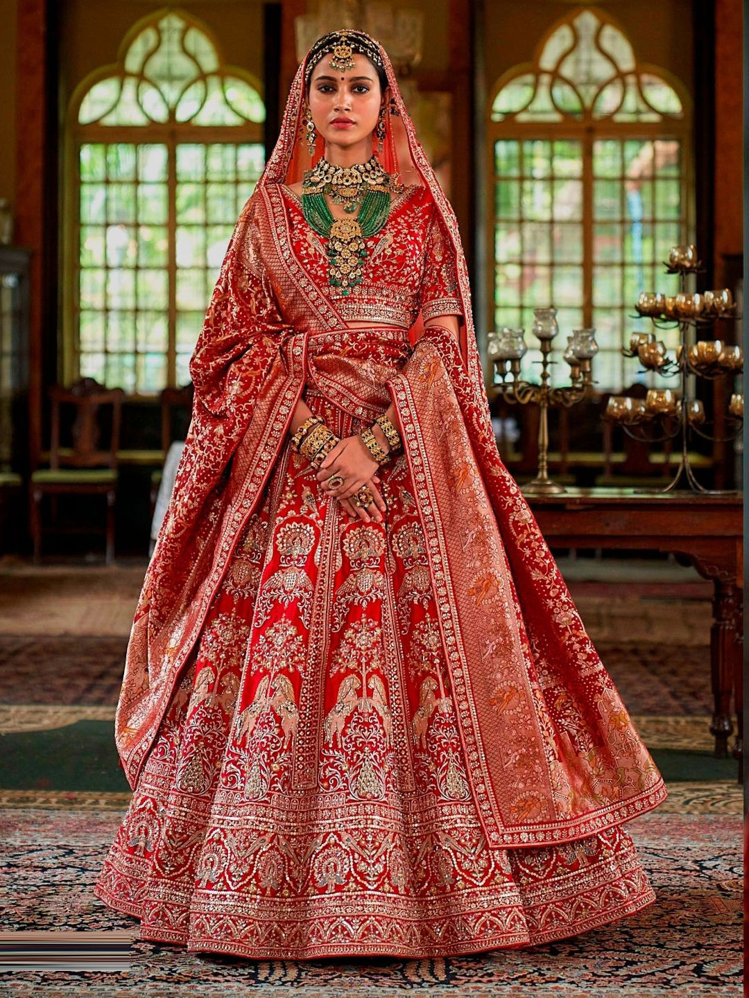 Silk Bridal Lehenga in Red and Maroon with Moti work