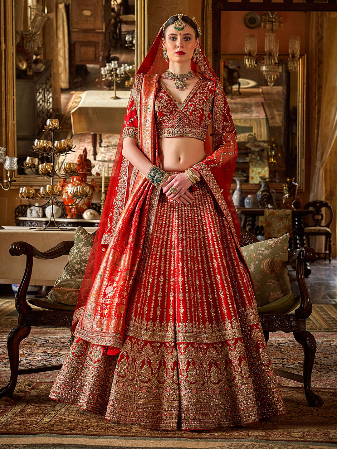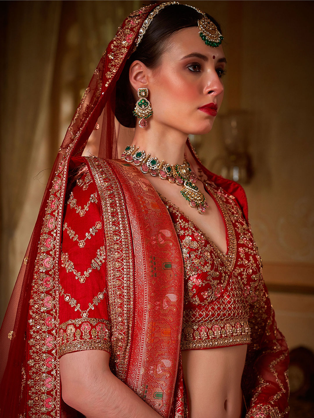 Silk Wedding Lehenga in Red and Maroon with Zari work