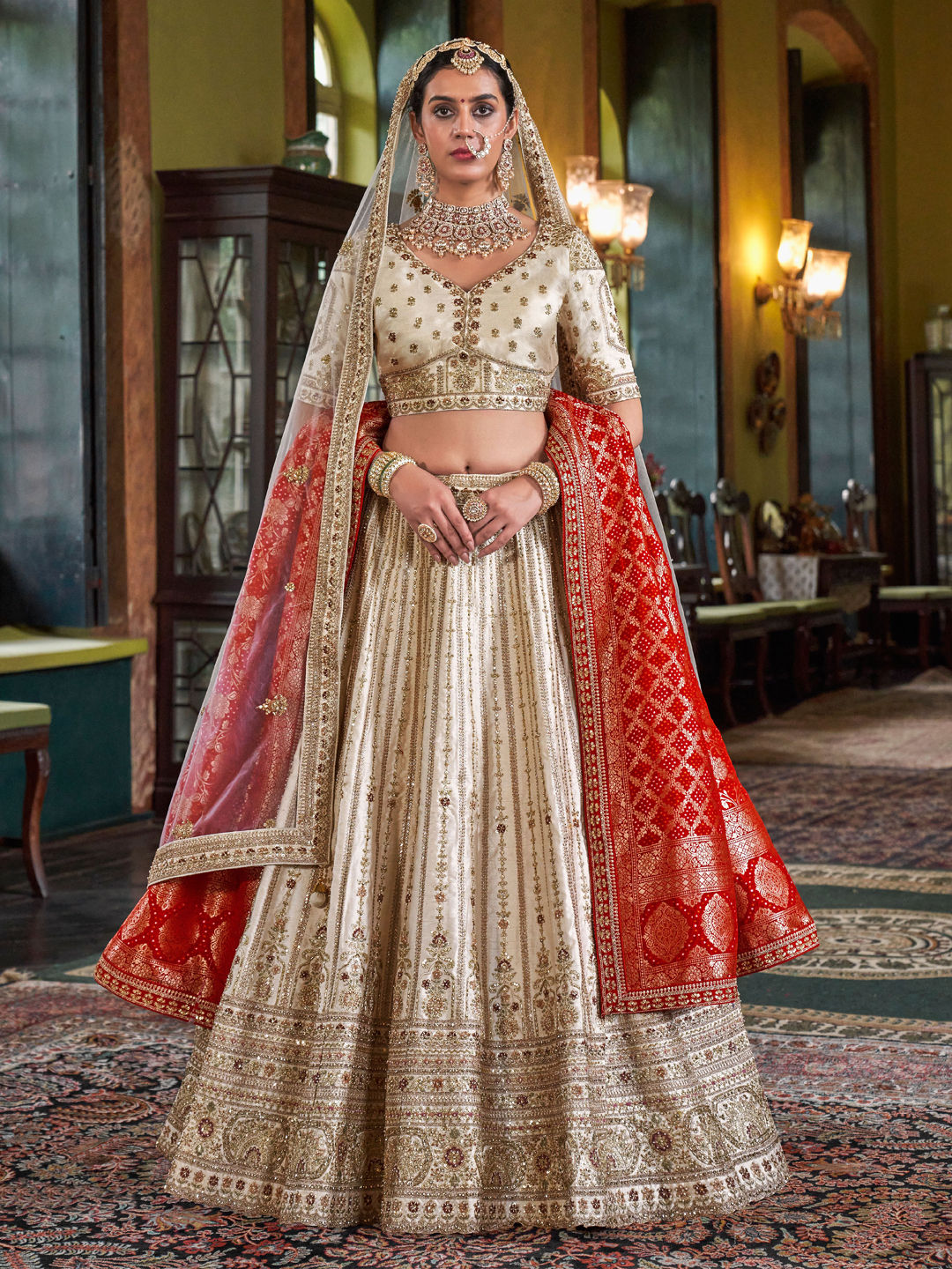 White and Off White color Lehenga in Silk fabric with Border, Embroidered, Sequence, Stone, Thread, Weaving, Zari work