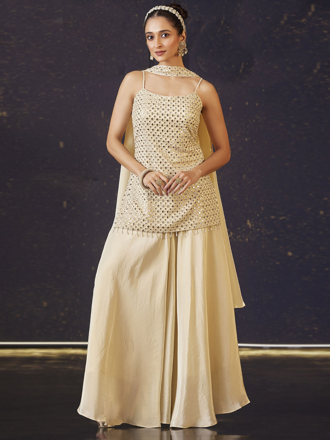 White and Off White color Salwar Kameez in Silk fabric with Bugle Beads, Cut Dana, Mirror work