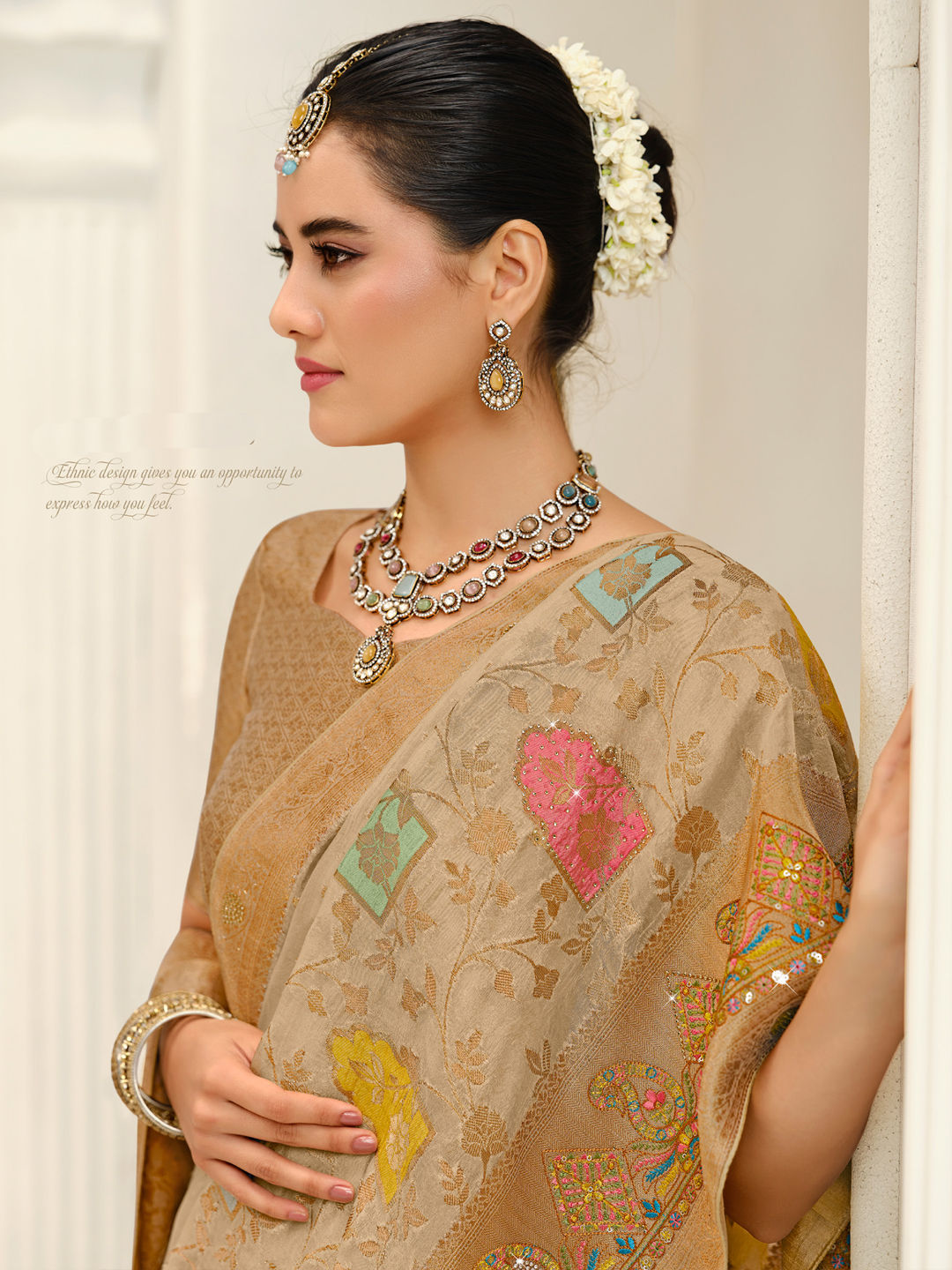 Beige and Brown color Saree in Silk fabric with Stone, Weaving, Zari work