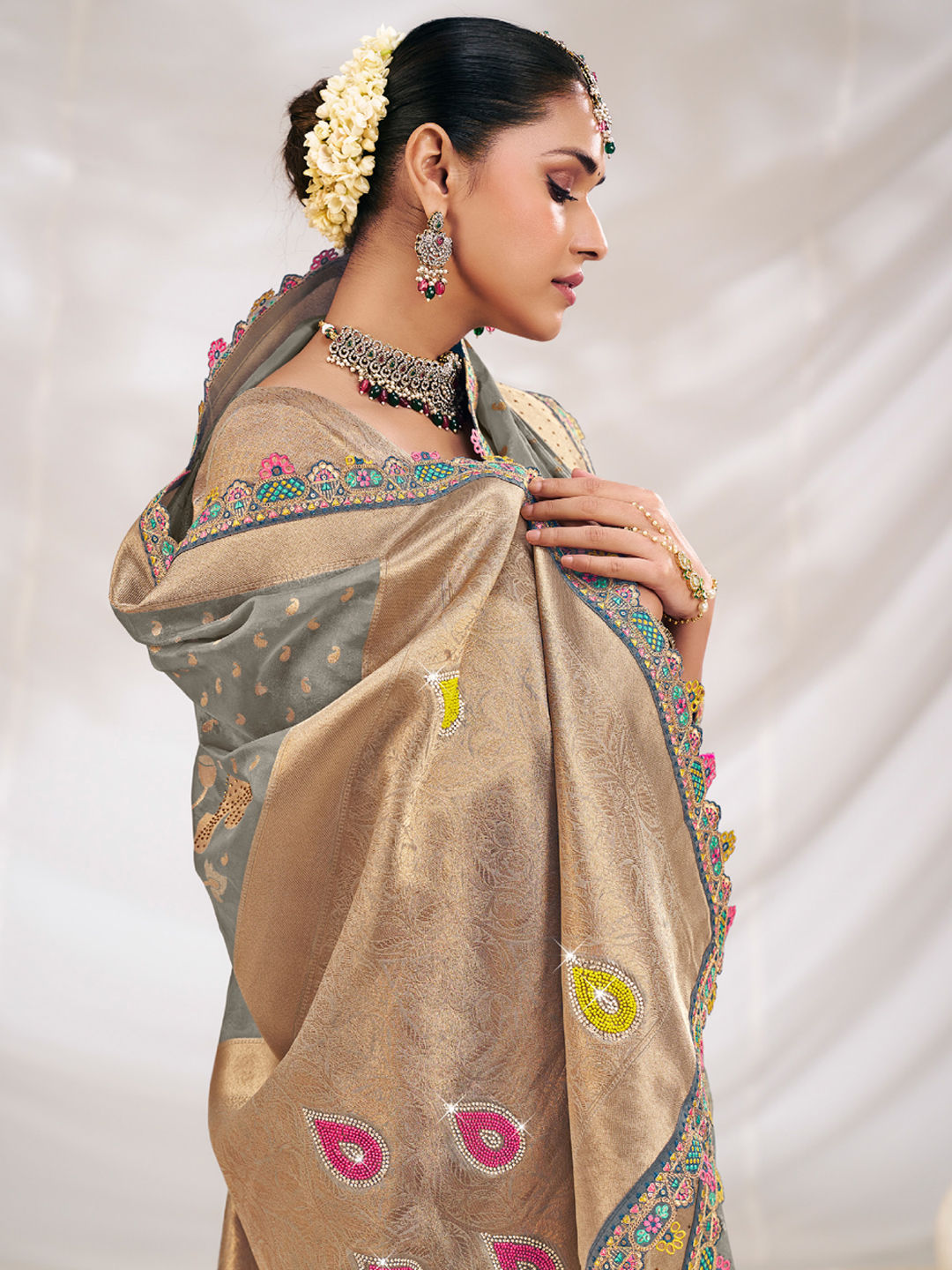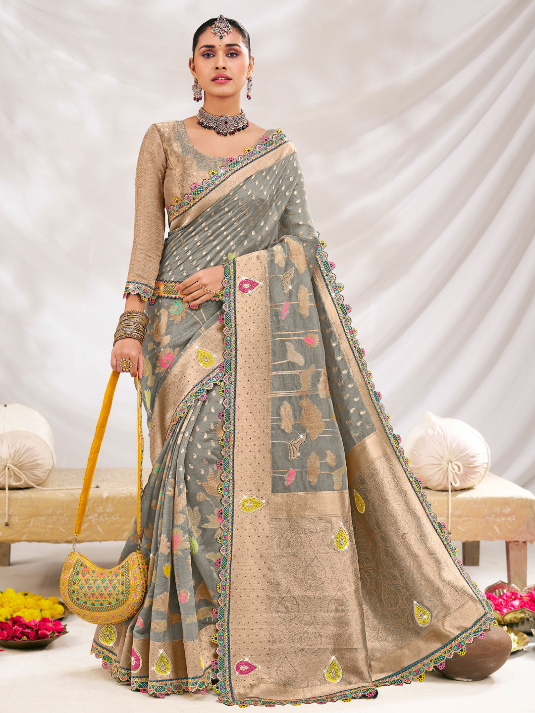 Black and Grey color Saree in Silk fabric with Border, Sequence, Stone, Weaving work