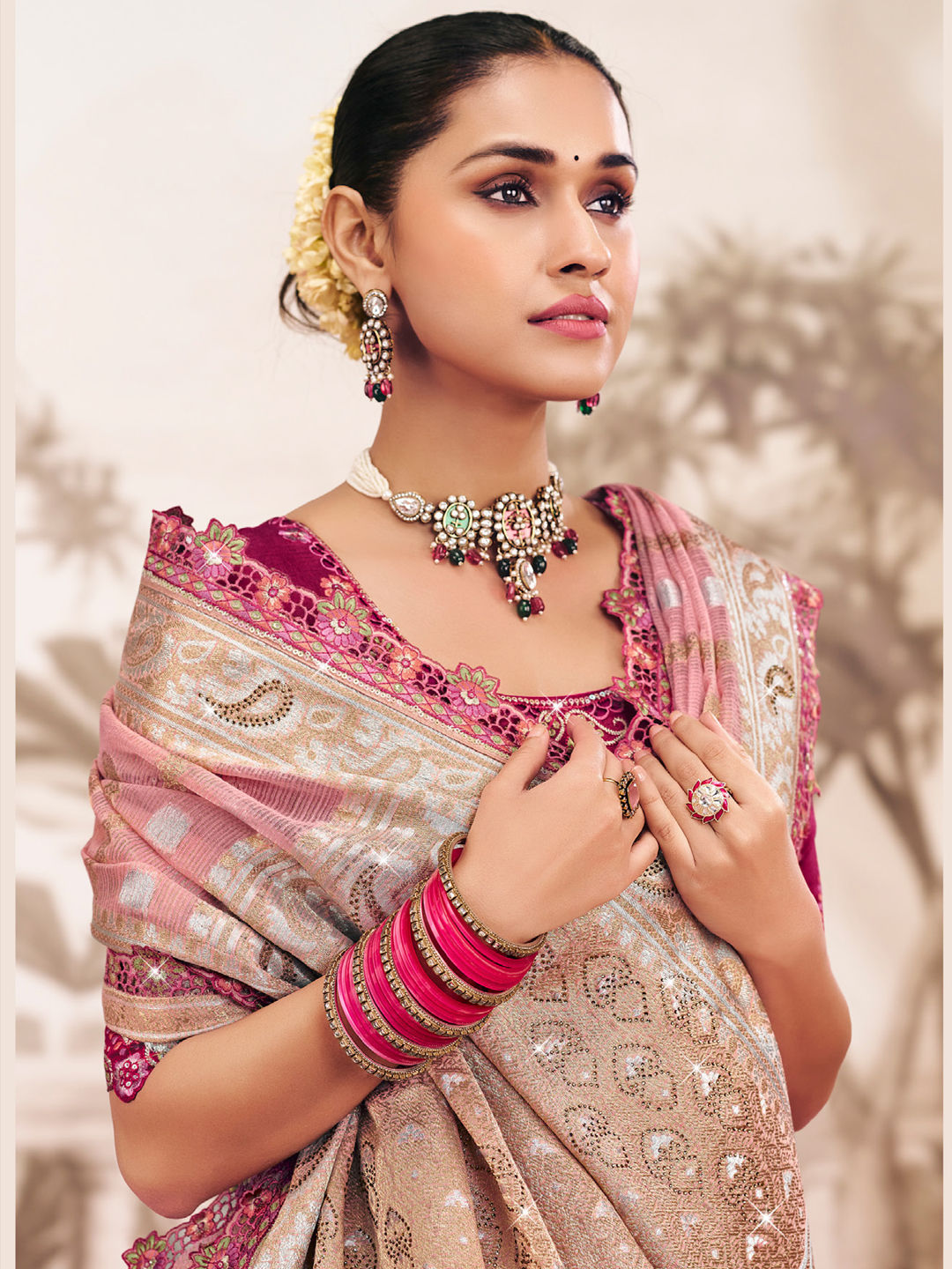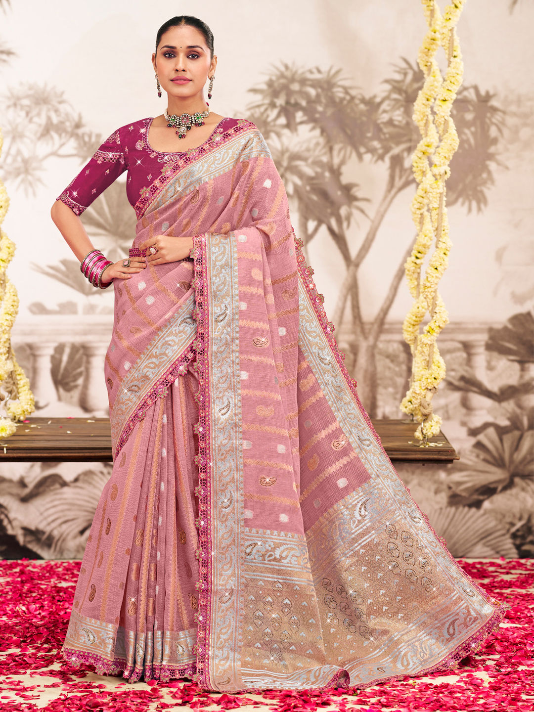 Pink and Majenta color Saree in Silk fabric with Lace, Weaving, Zircon work
