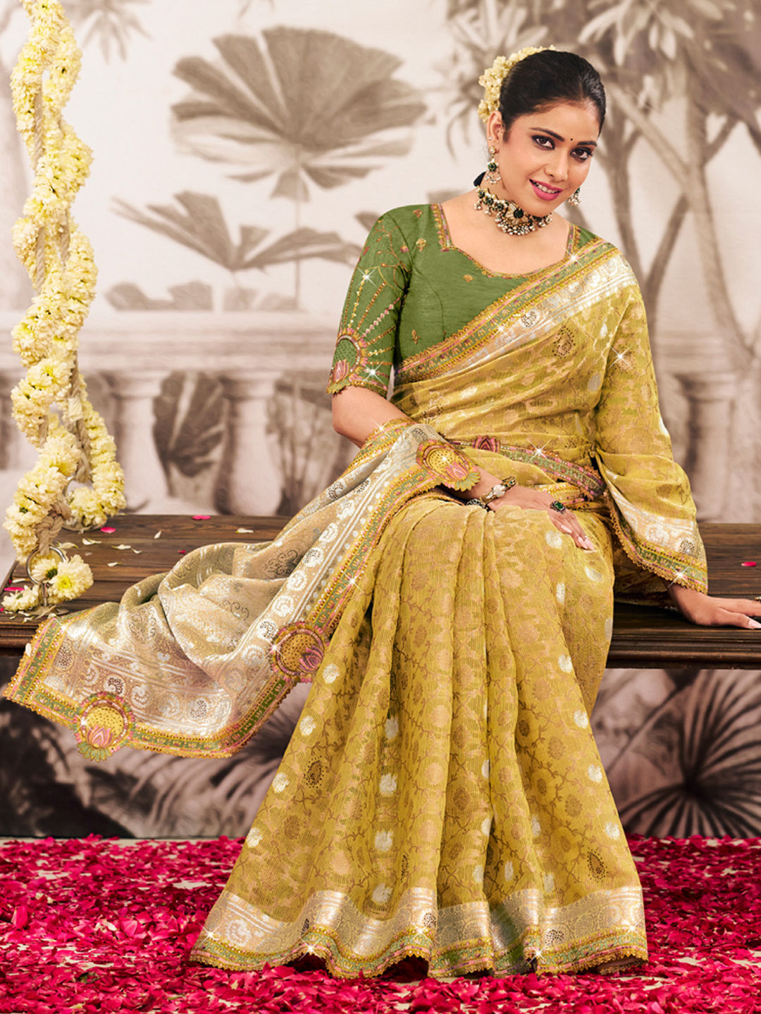 Yellow color Saree in Silk fabric with Lace, Weaving, Zircon work