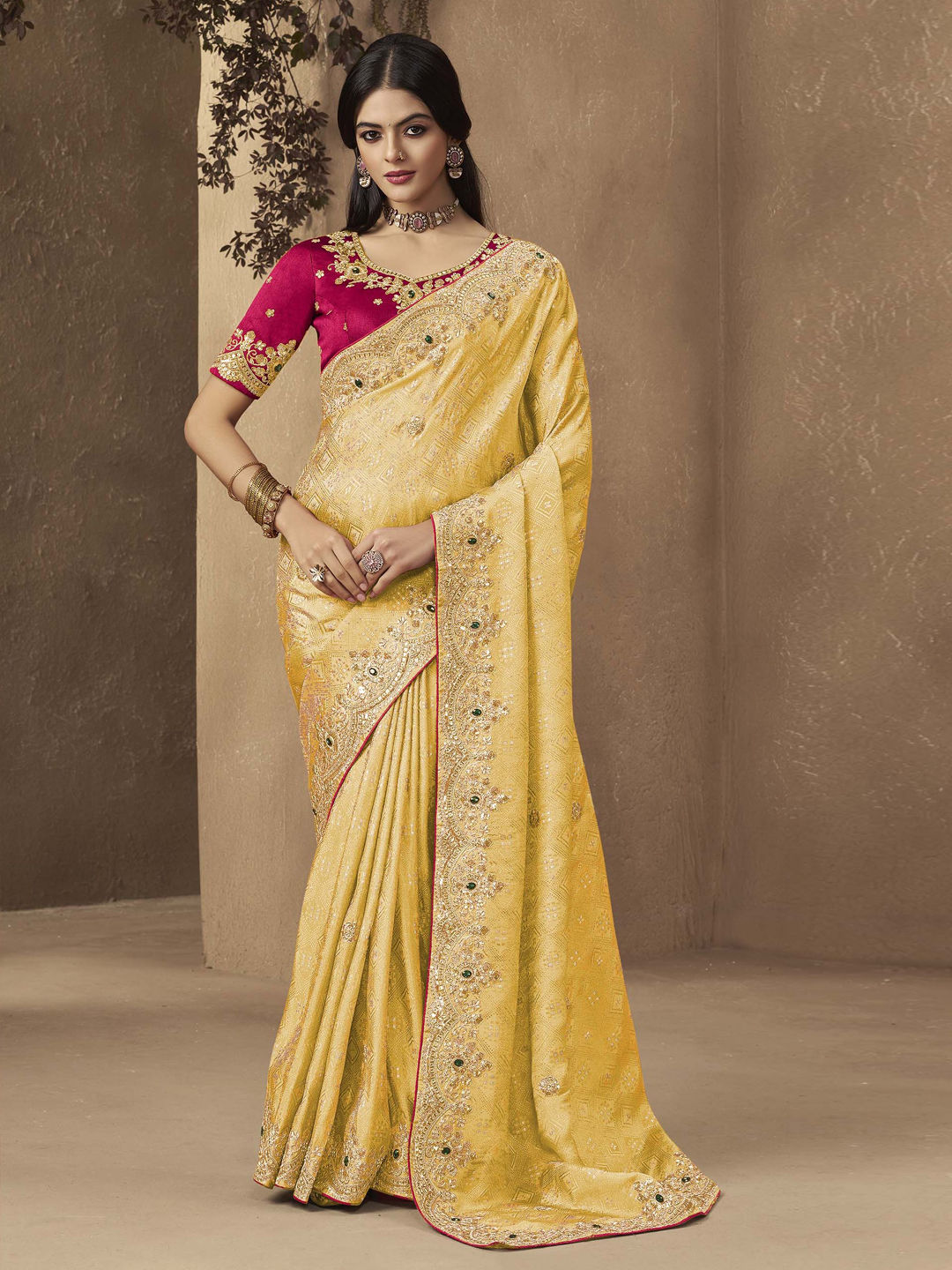 Yellow color Saree in Silk fabric with Sequence, Stone, Thread work
