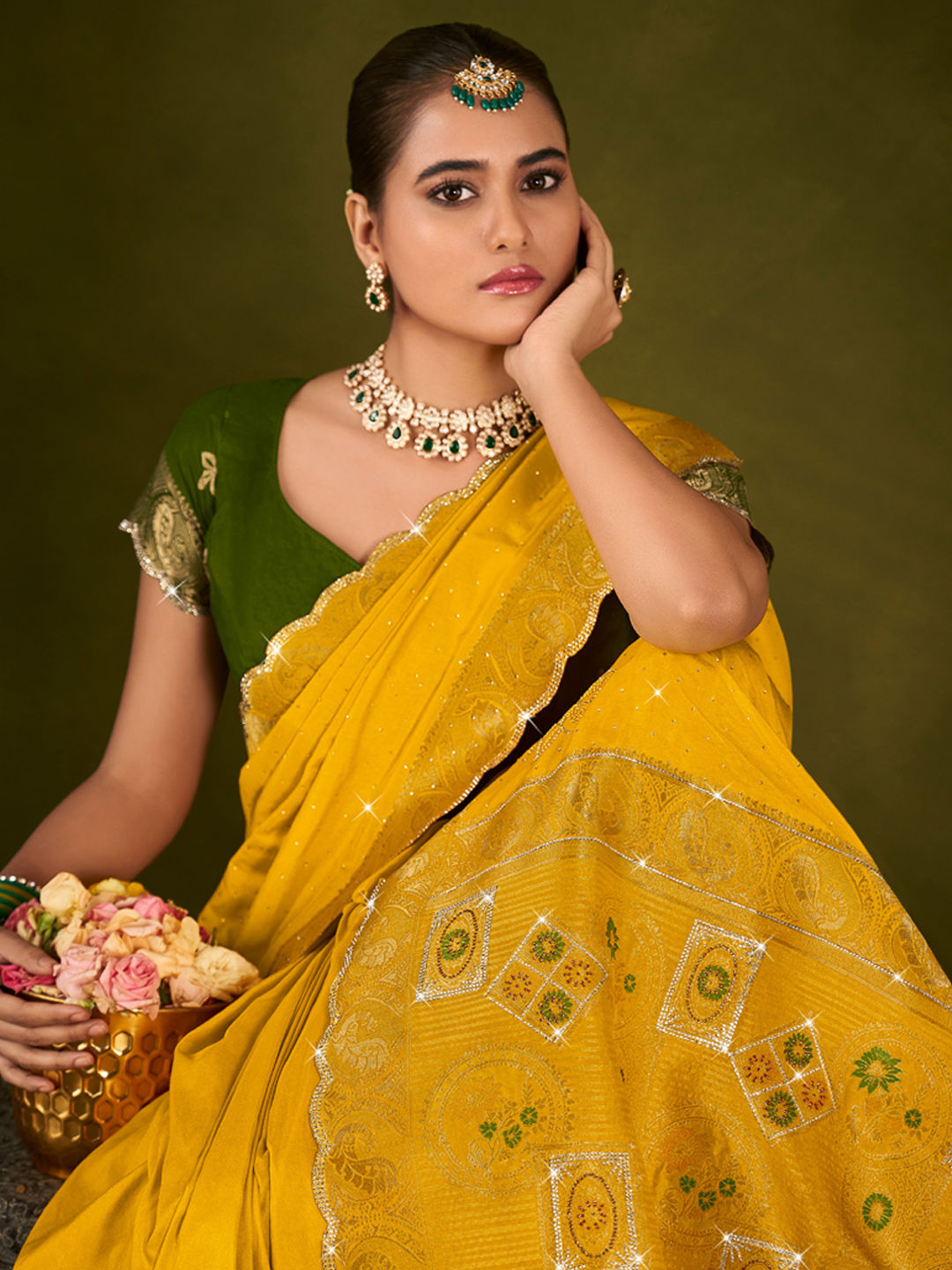 Yellow color Saree in Silk fabric with Swarovski, Weaving, Zircon work