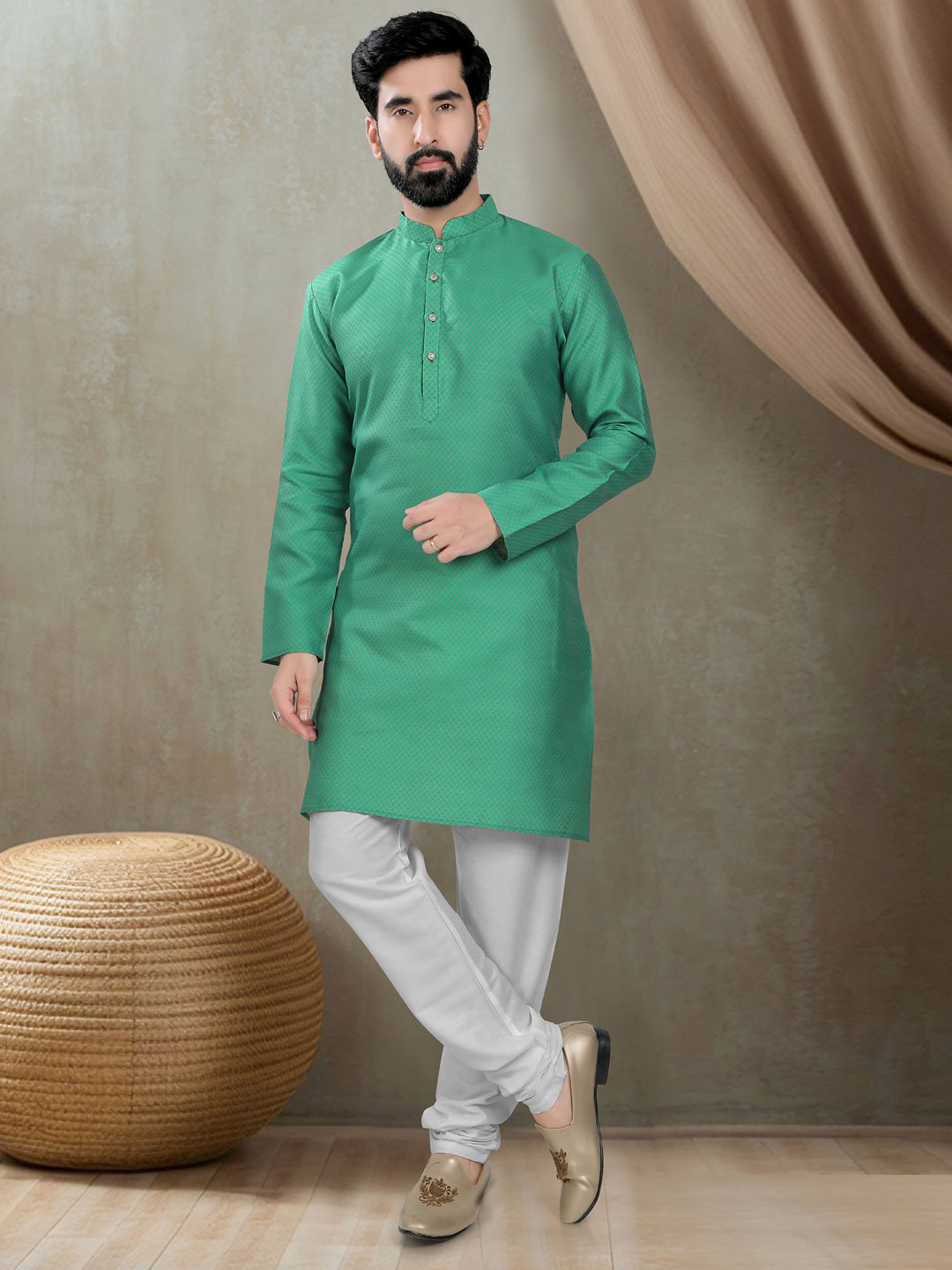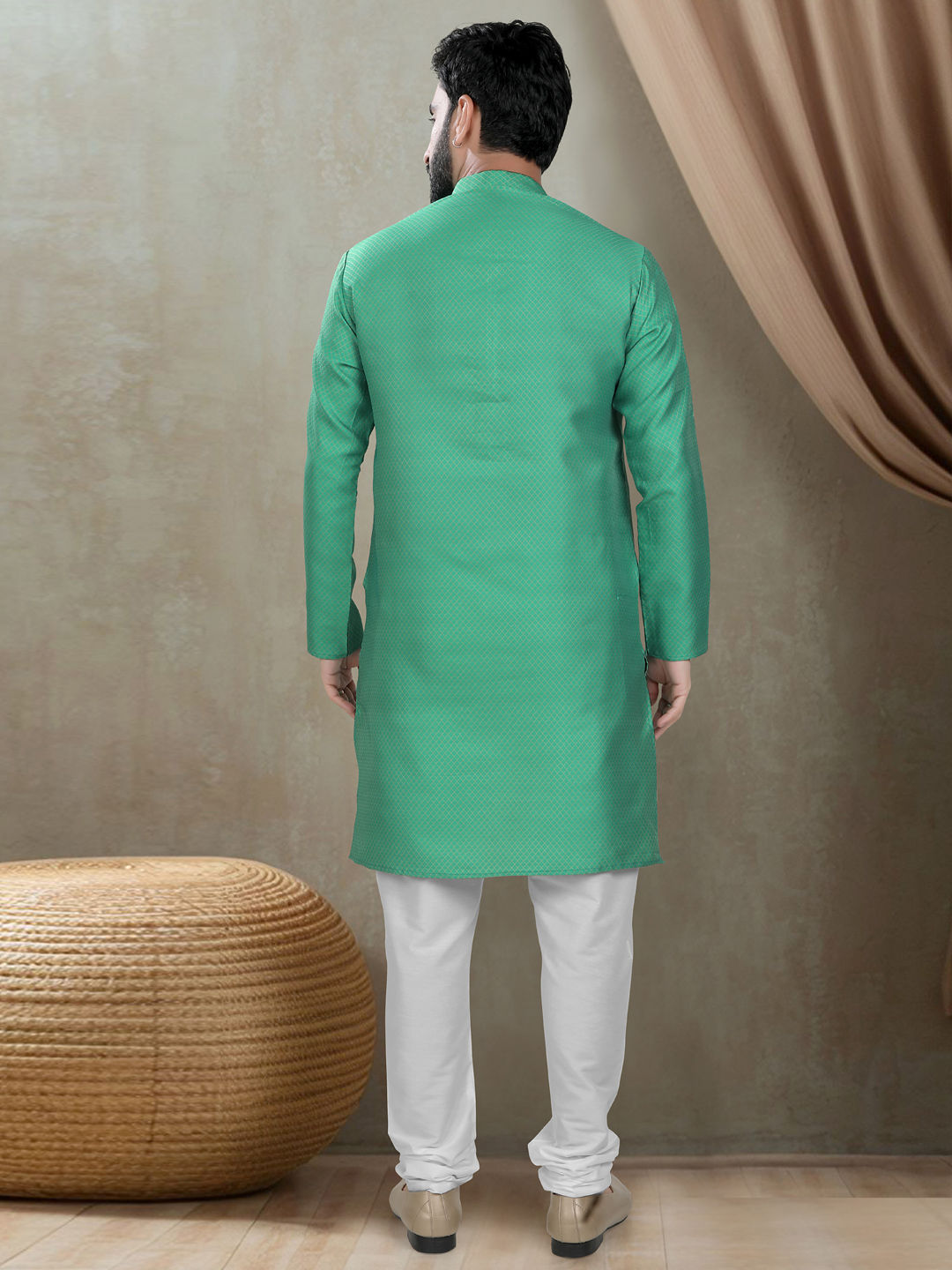 Silk Festive Kurta Pyjamas in Green with Printed work