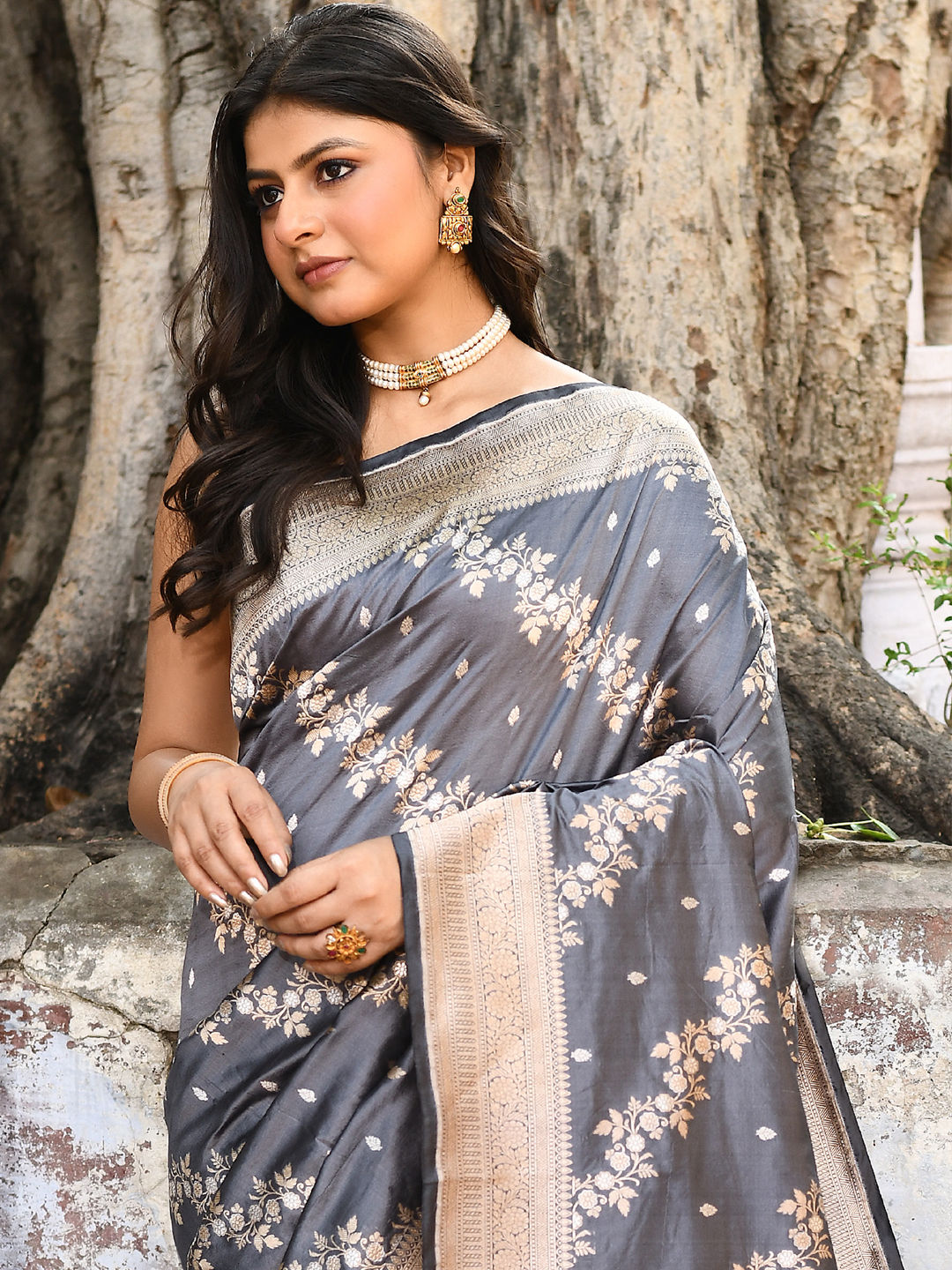 Black and Grey color Saree in Silk cotton fabric with Border, Zari work