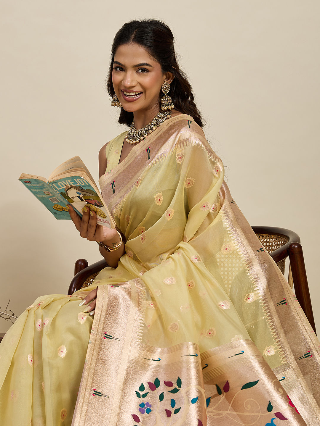 Silk cotton Party Wear Saree in Yellow with Weaving work
