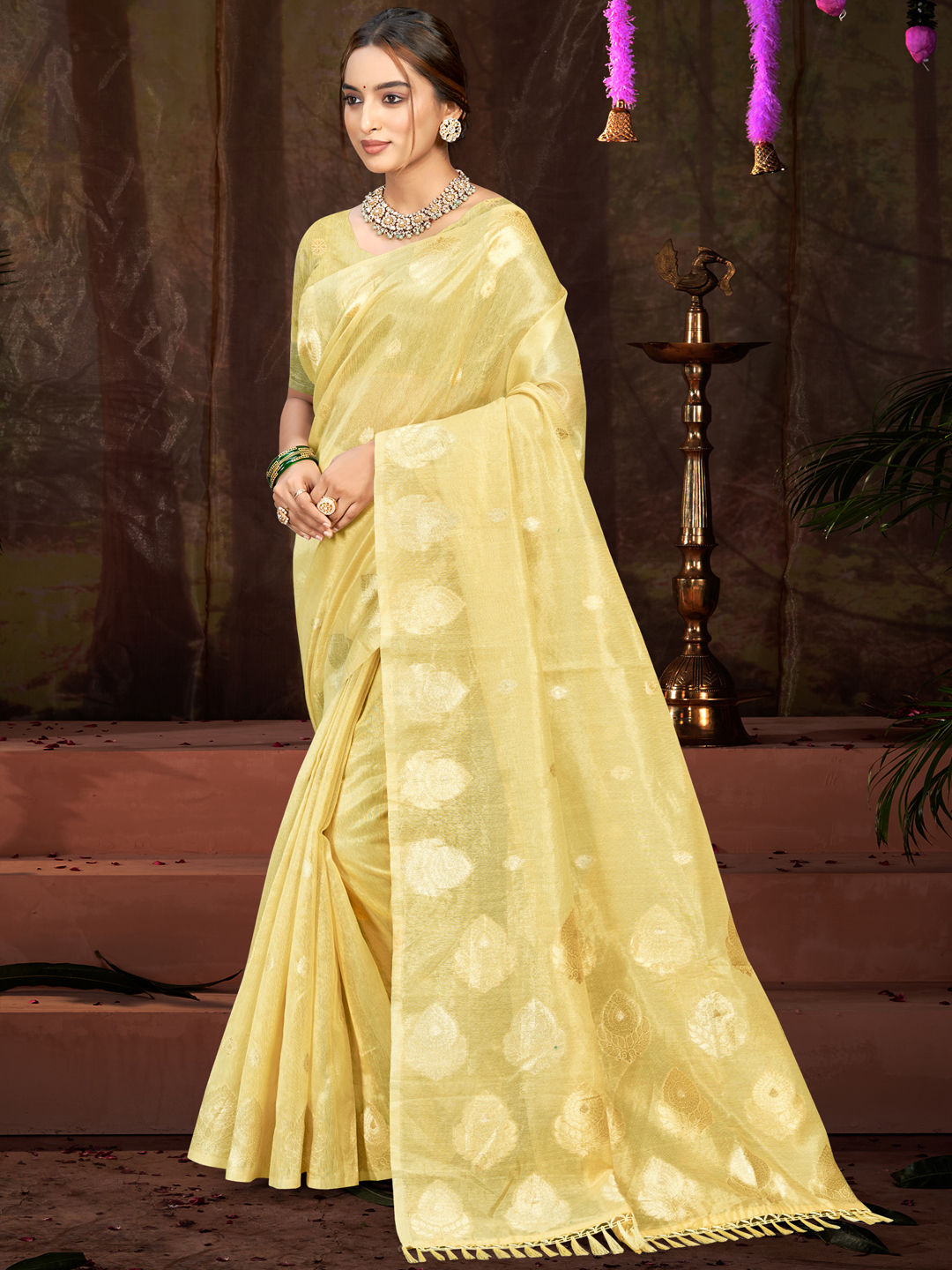 Yellow color Saree in Silk cotton fabric with Weaving work