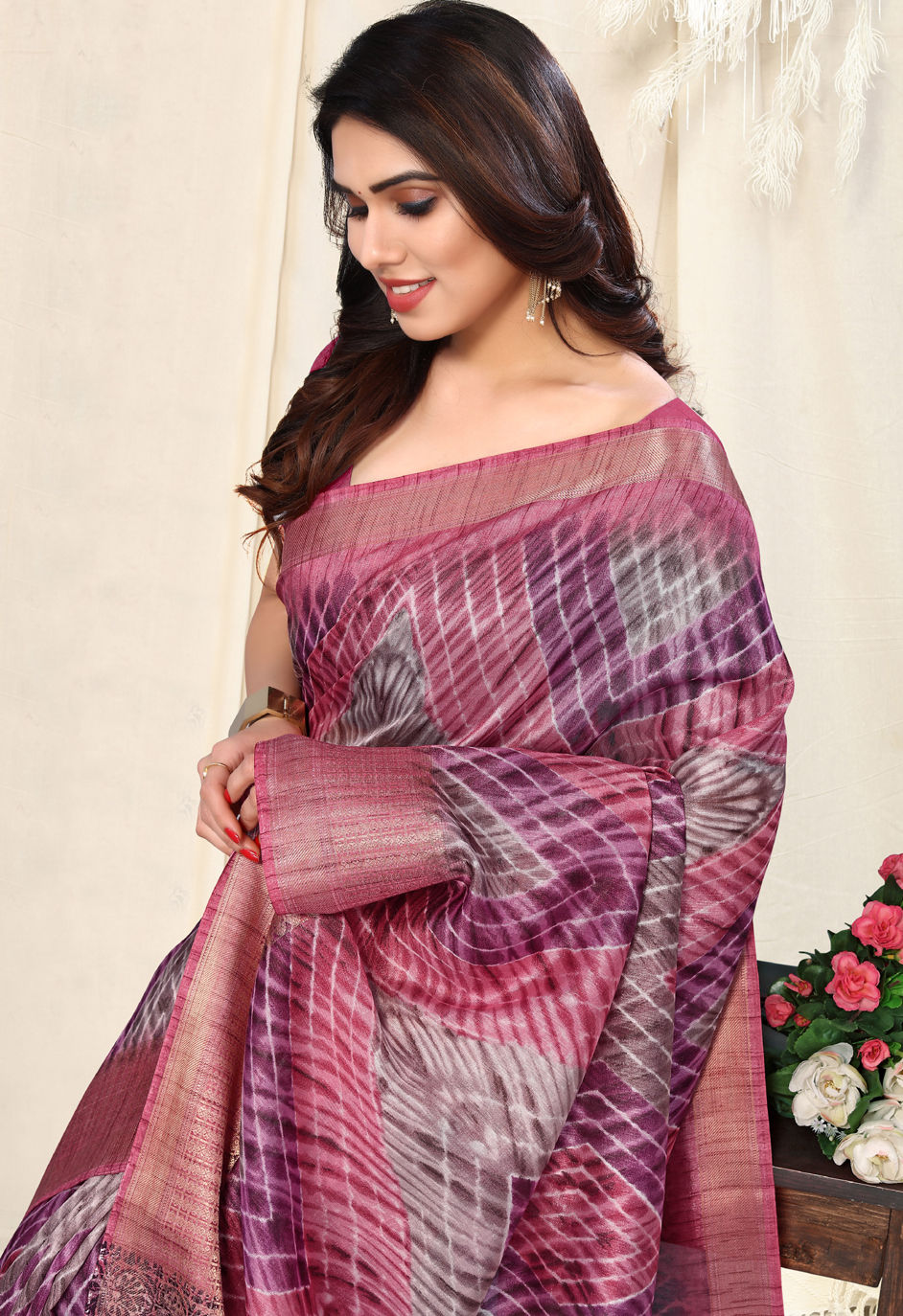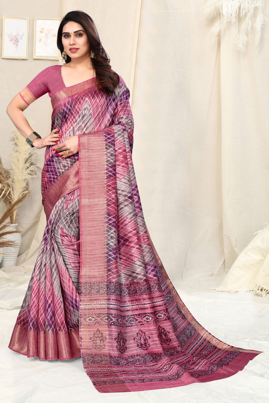 Pink and Majenta color Saree in Silk, Silk cotton fabric with Lehariya, Printed work