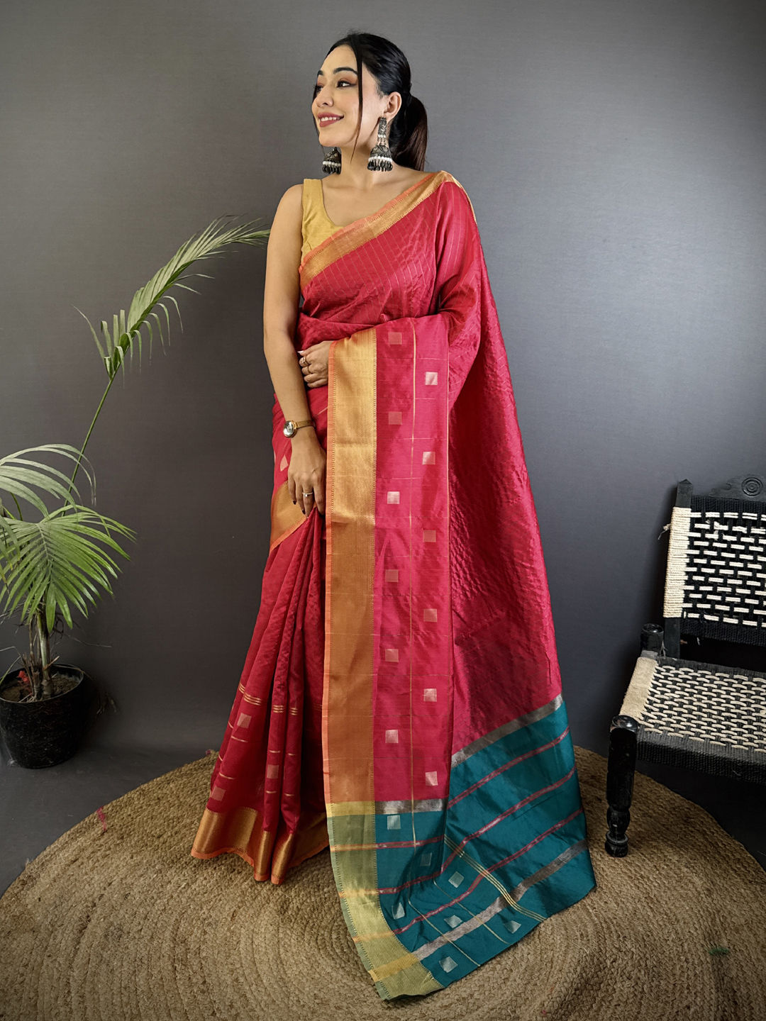 Silk cotton Party Wear Saree in Red and Maroon with Weaving work