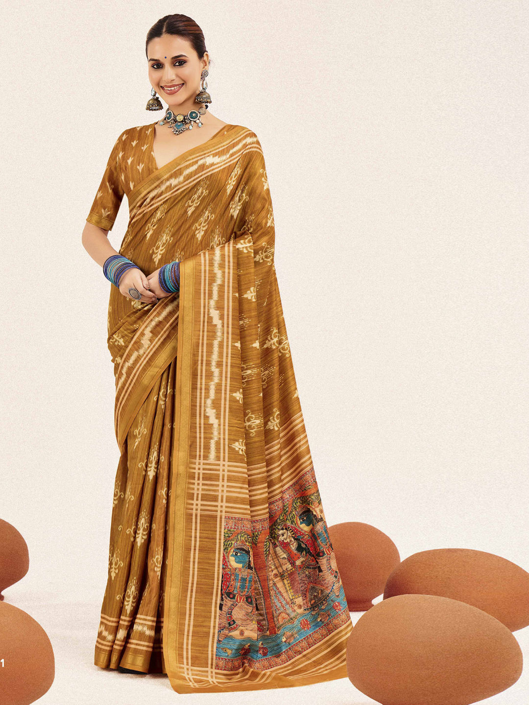 Silk cotton Traditional Saree in Beige and Brown with Digital Print work