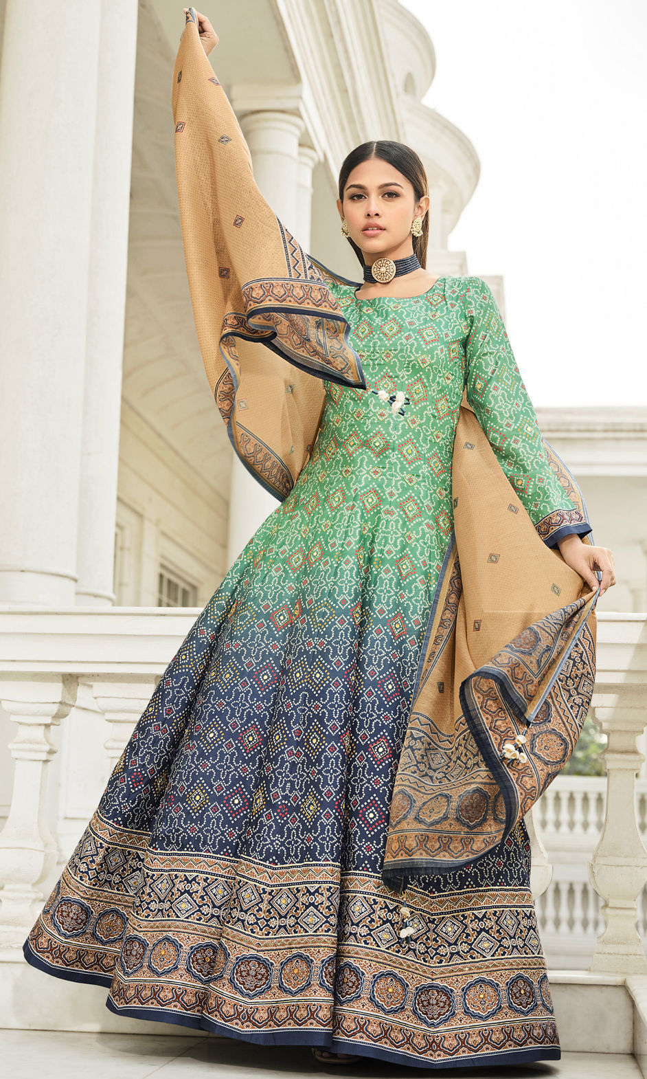 Blue, Green color Gown in Silk fabric with Bandhej, Embroidered, Printed, Thread work