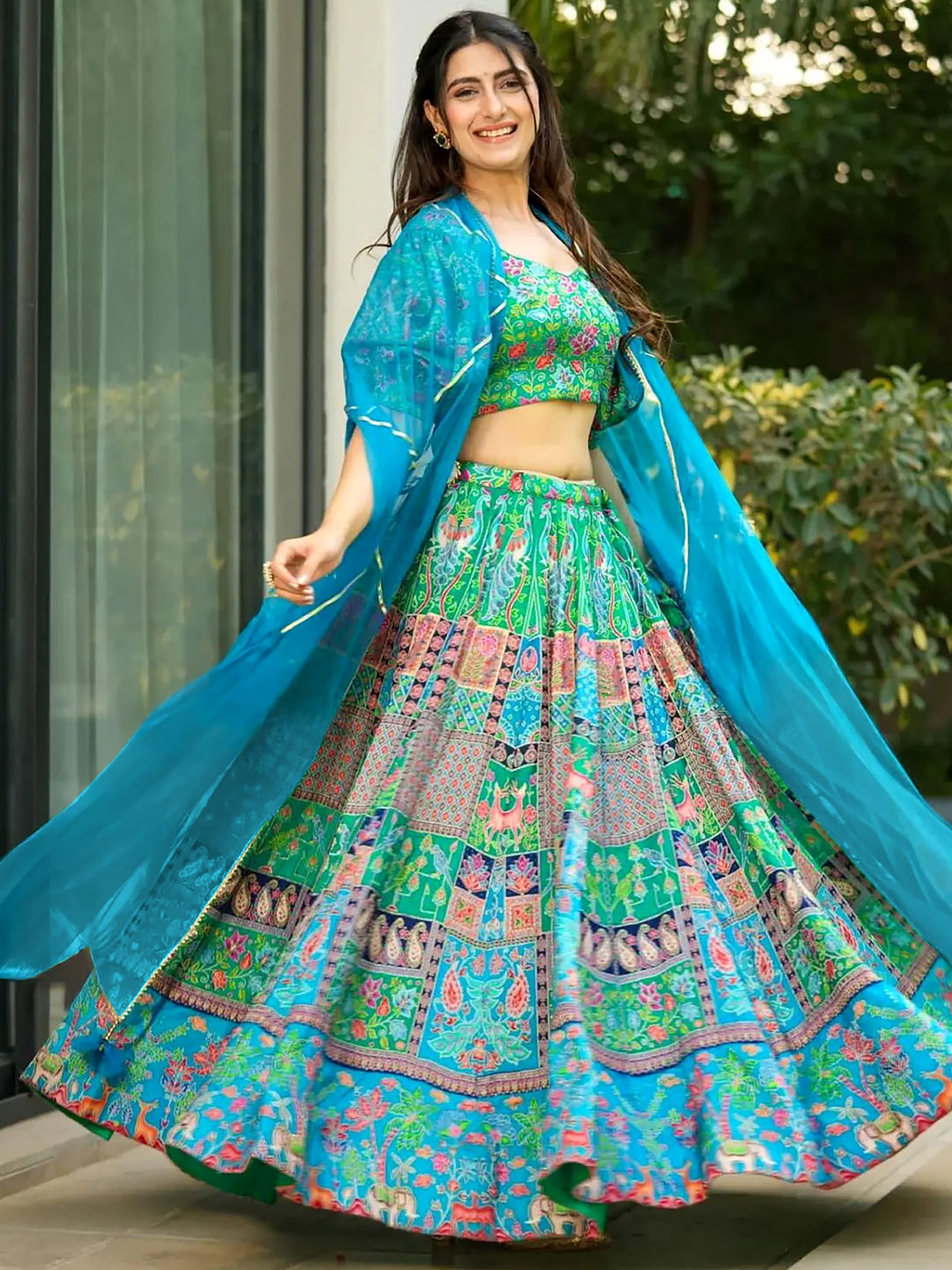 Silk Engagement Ready to Wear Lehenga in Green with Digital Print work
