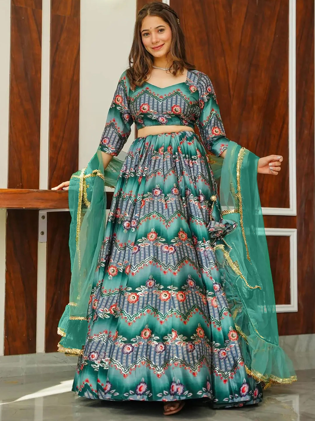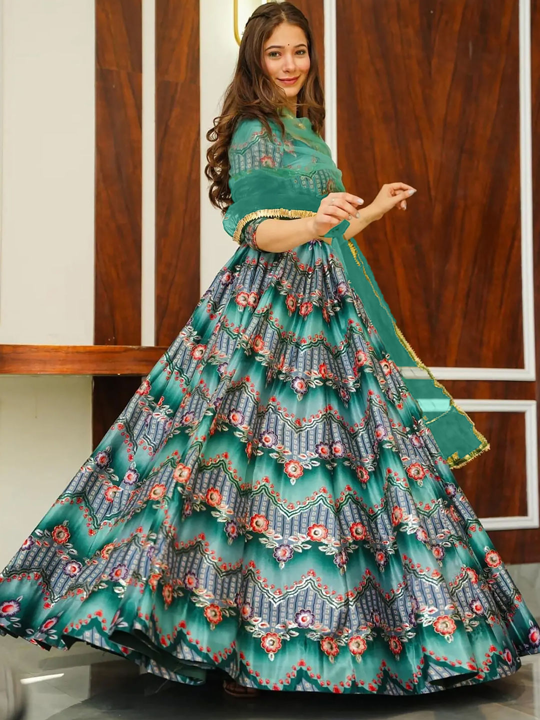 Silk Engagement Ready to Wear Lehenga in Green with Digital Print work